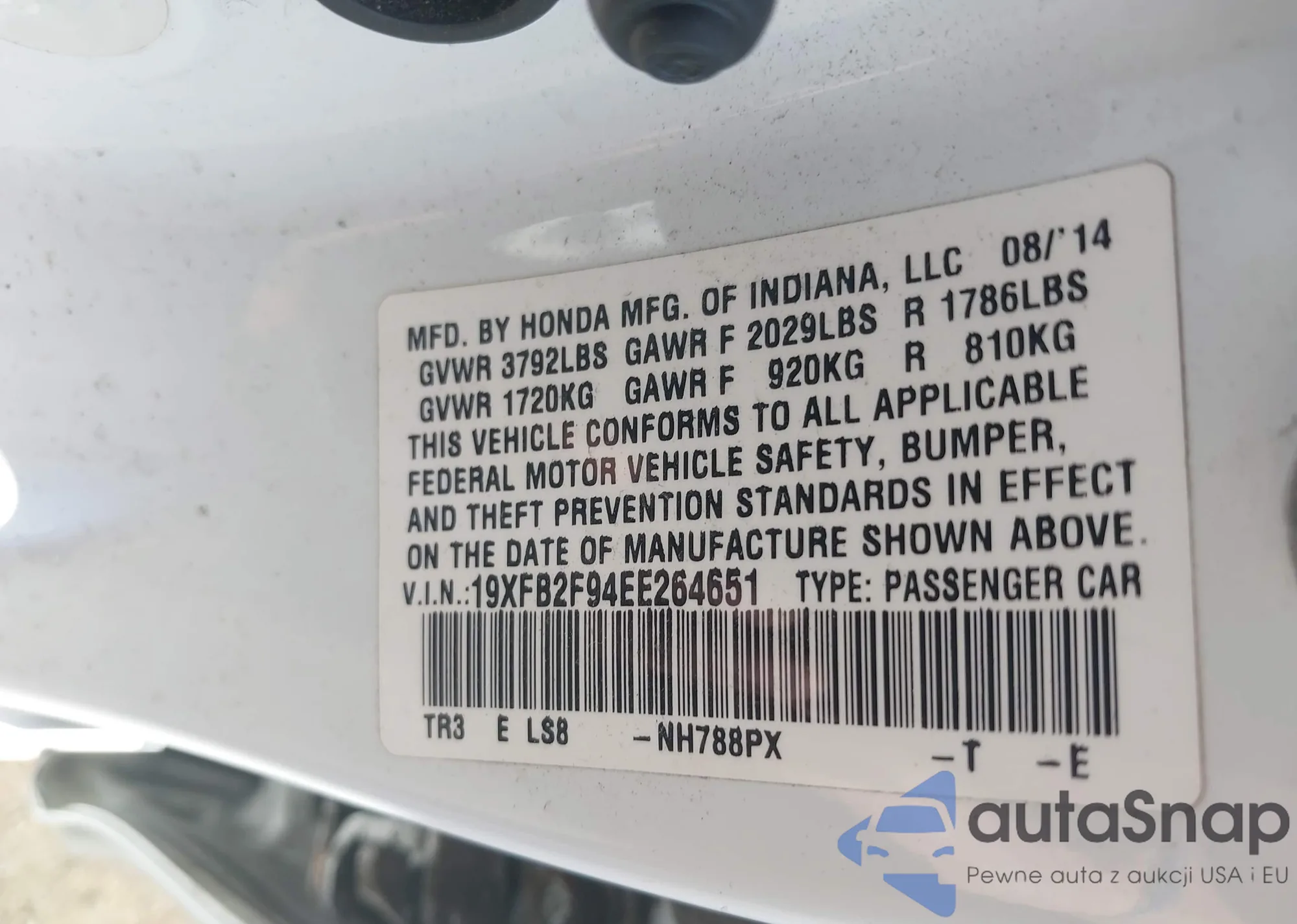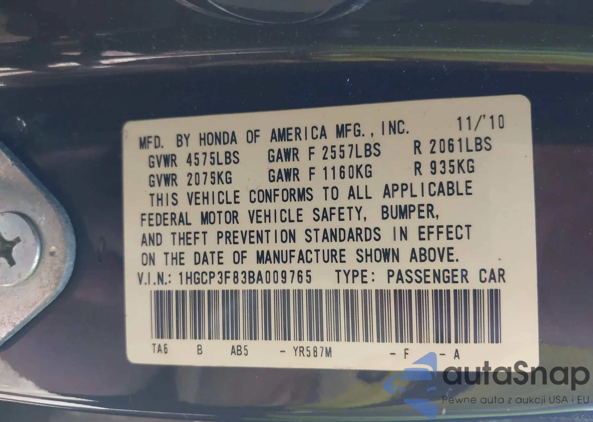 LOT: 42629759 VIN: 1HGCP3F83BA009765