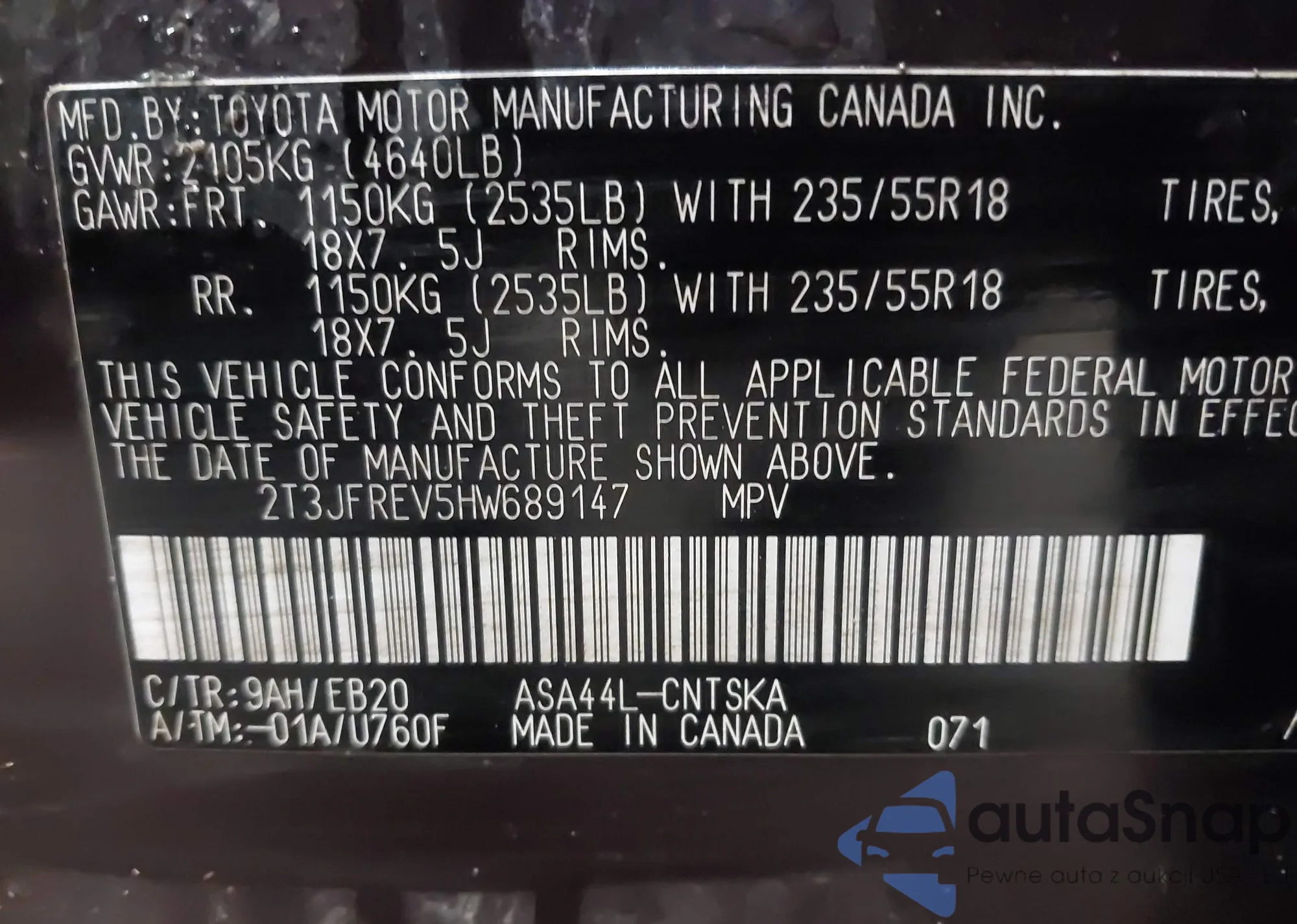 • VIN 2T3JFREV5HW689147