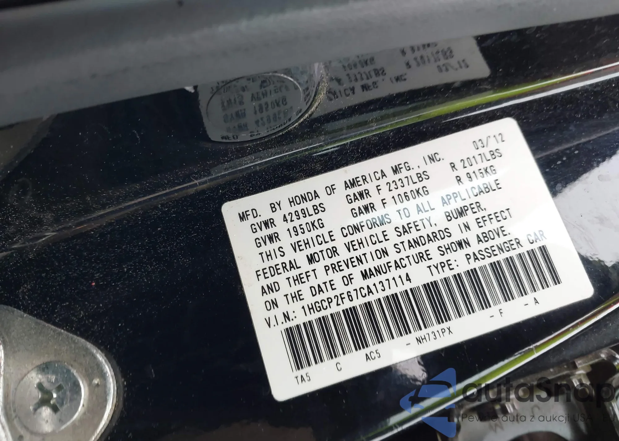 LOT: 42313409 VIN: 1HGCP2F67CA137114