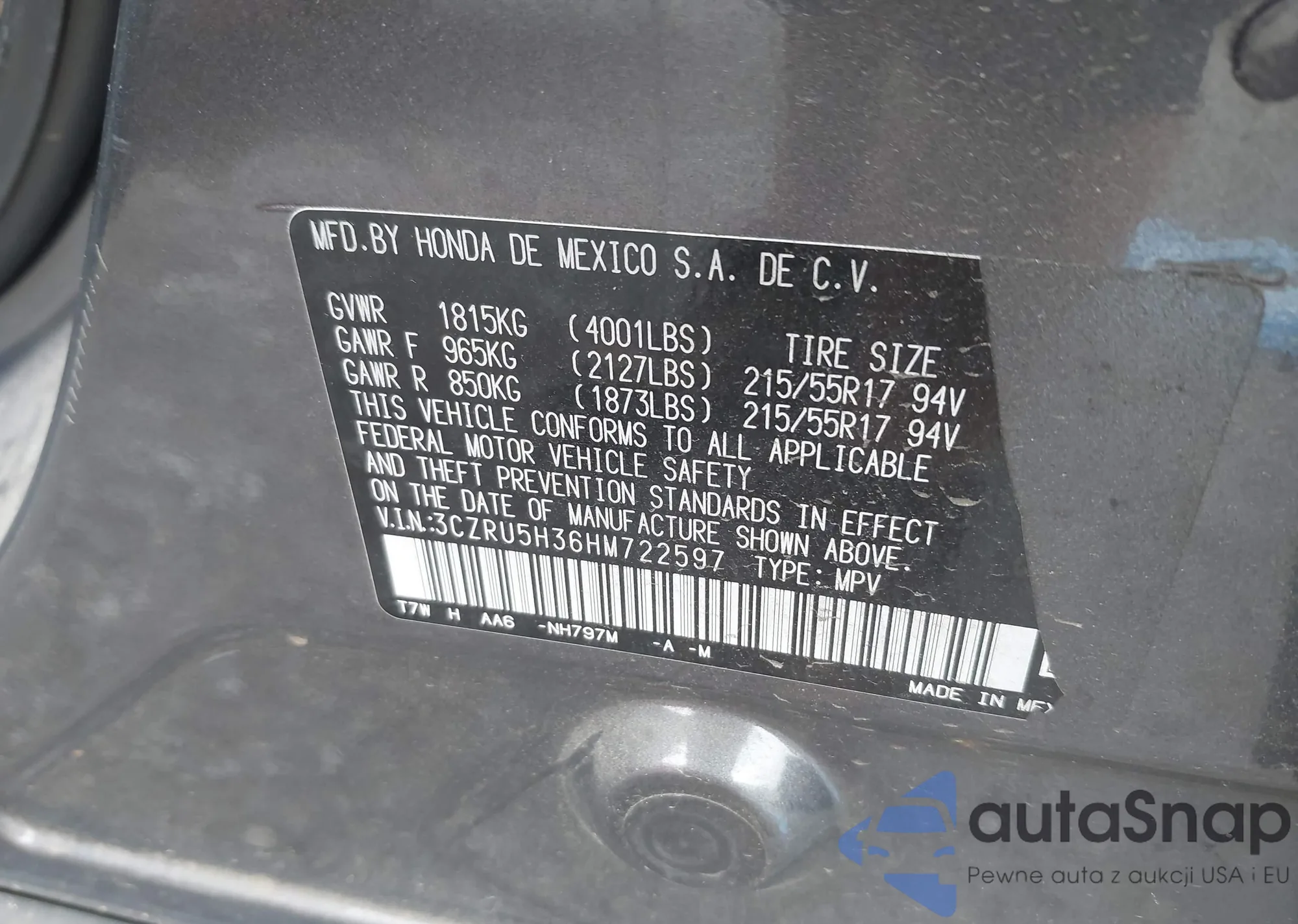 • VIN 3CZRU5H36HM722597