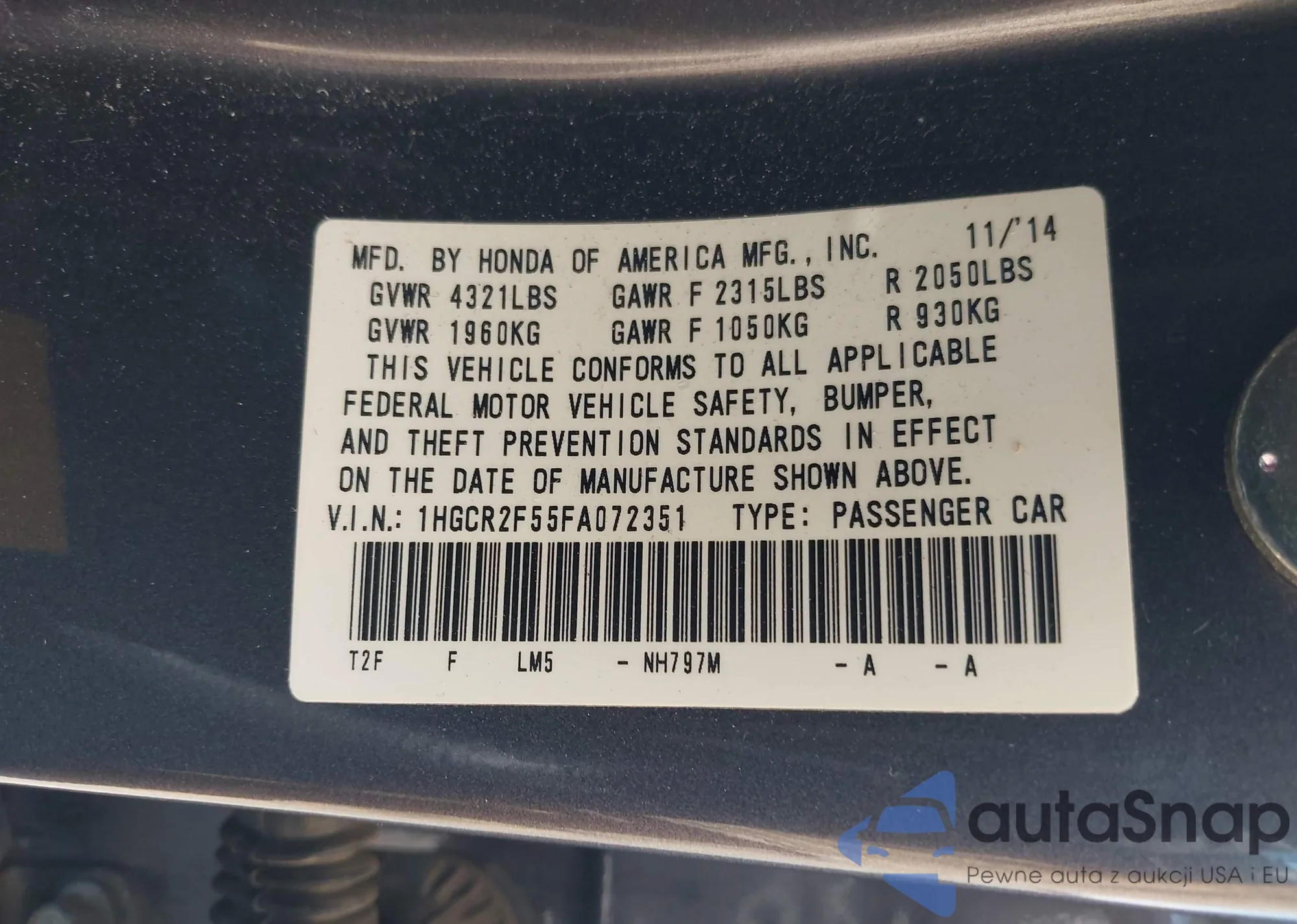 LOT: 42863810 VIN: 1HGCR2F55FA072351