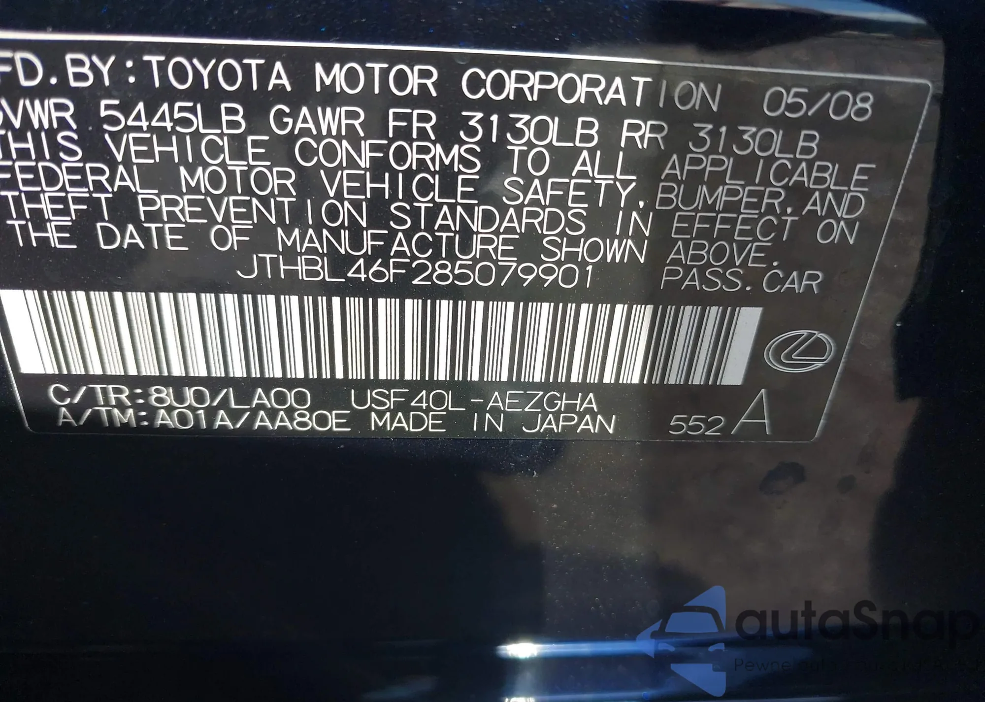 LOT: 42829798 VIN: JTHBL46F285079901