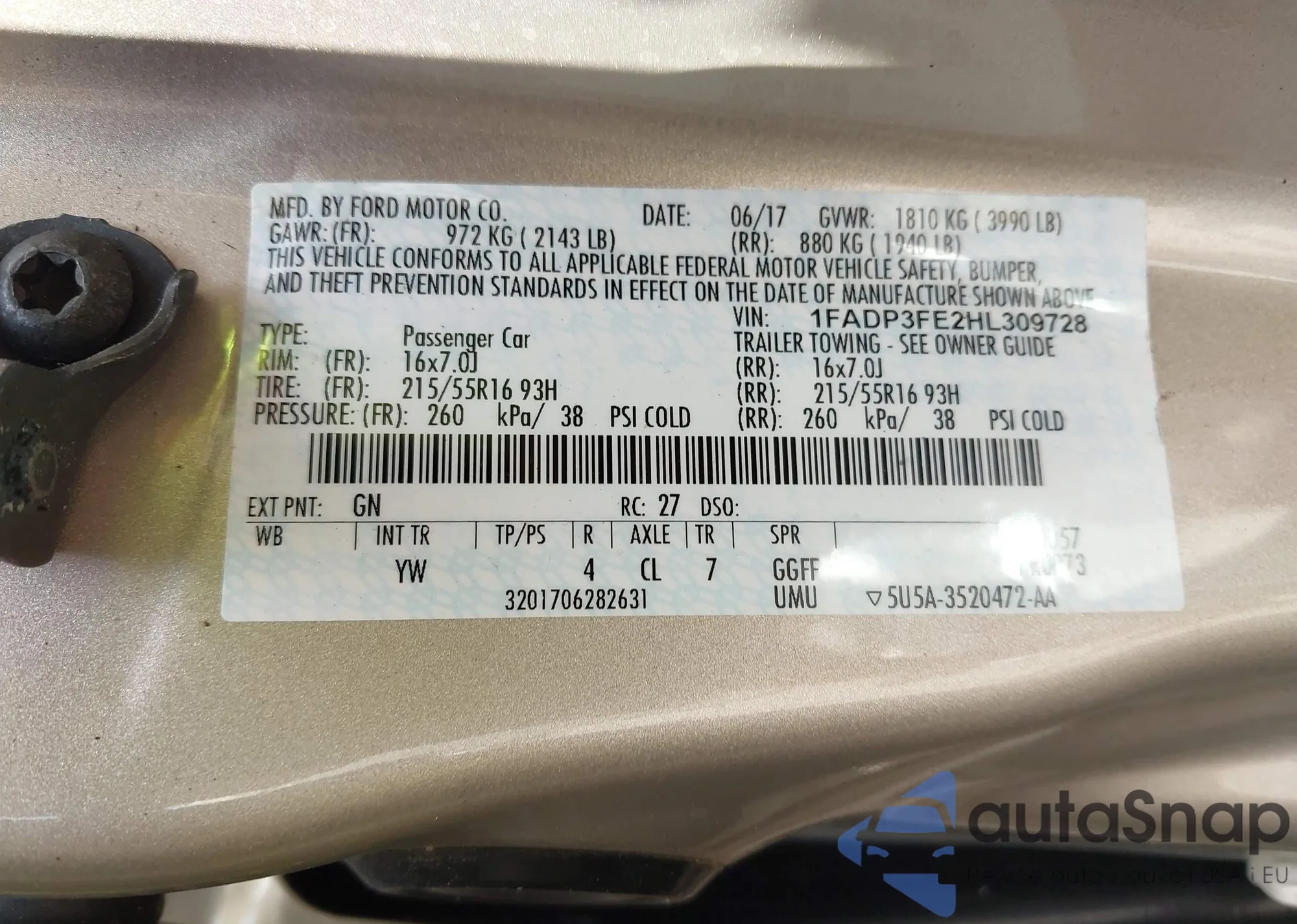 LOT: 42787378 VIN: 1FADP3FE2HL309728