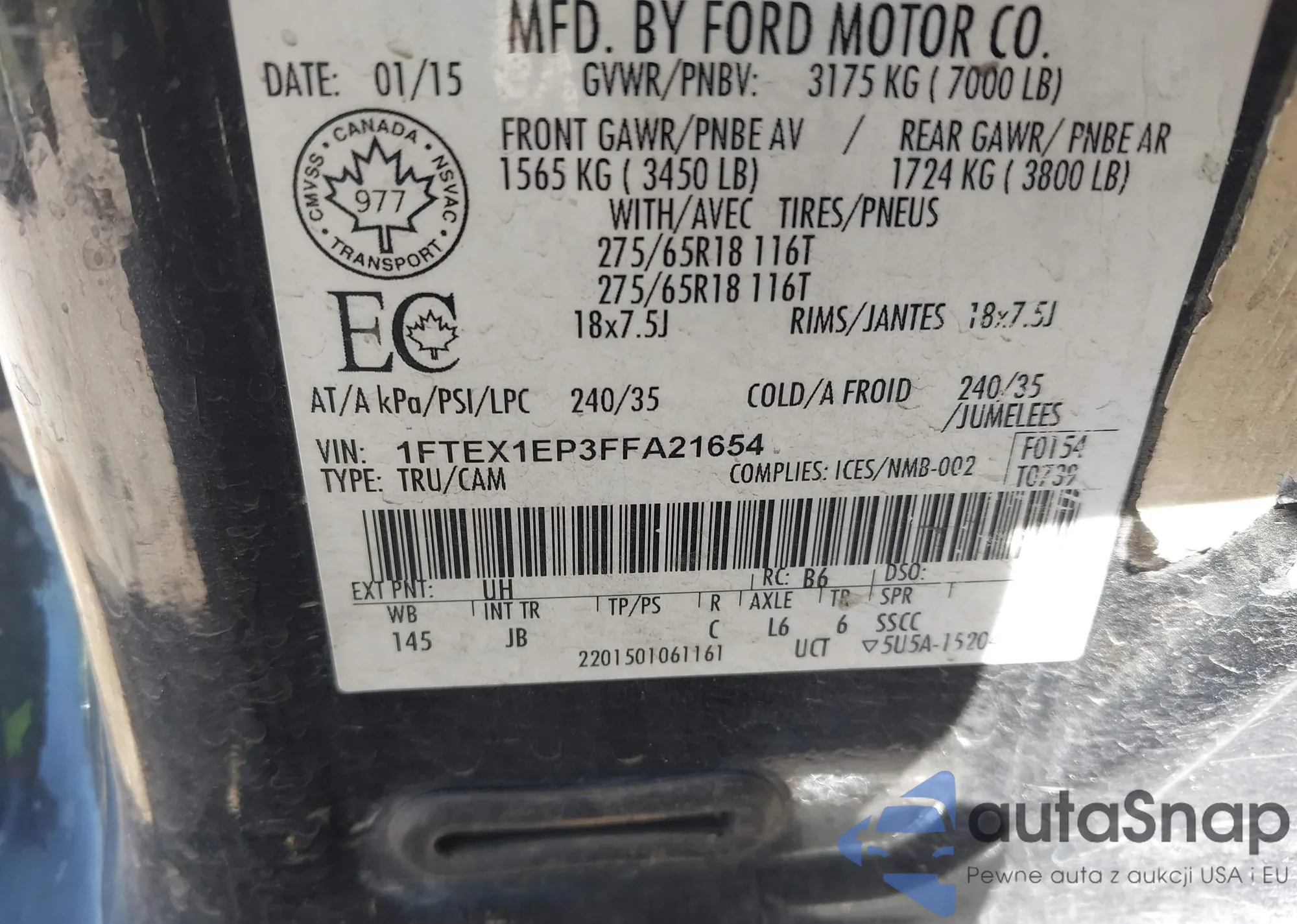 LOT: 42915991 VIN: 1FTEX1EP3FFA21654