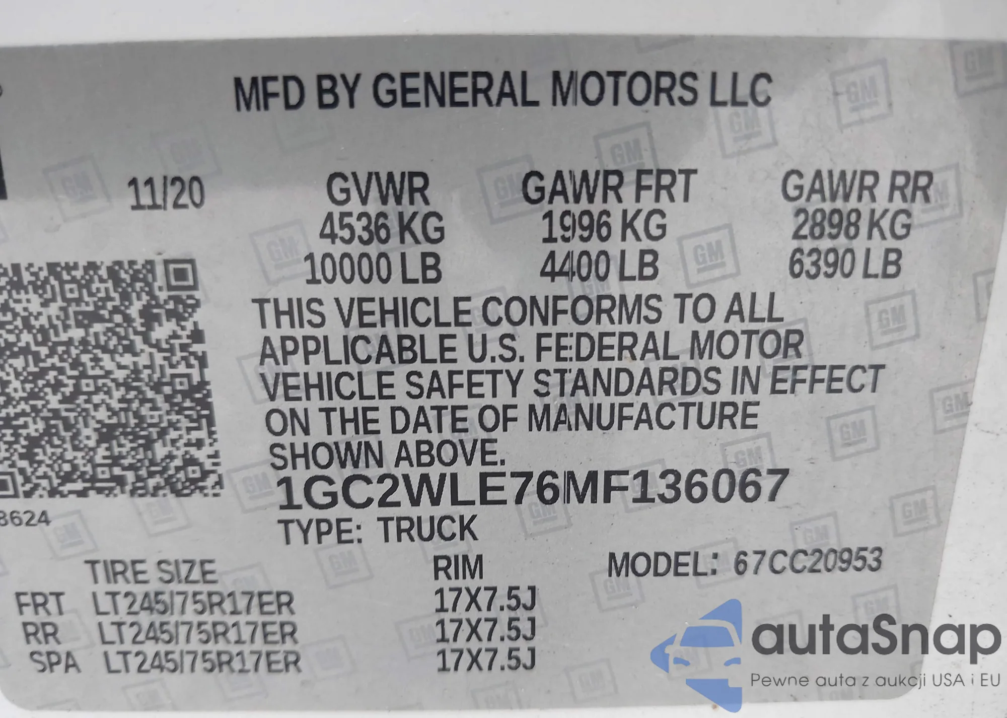 LOT: 42625954 VIN: 1GTW7AFPXM1196366