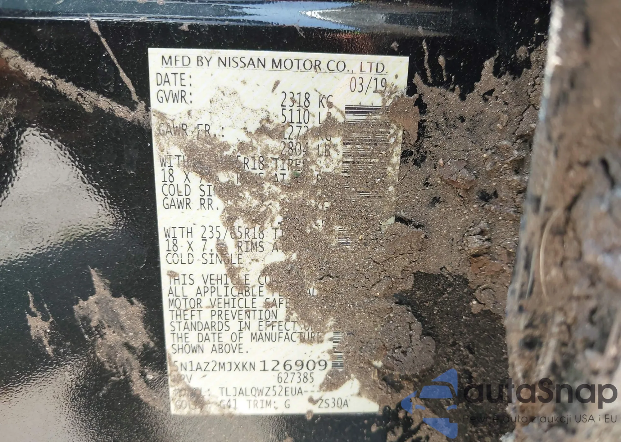 LOT: 42441034 VIN: 5N1AZ2MJXKN126909