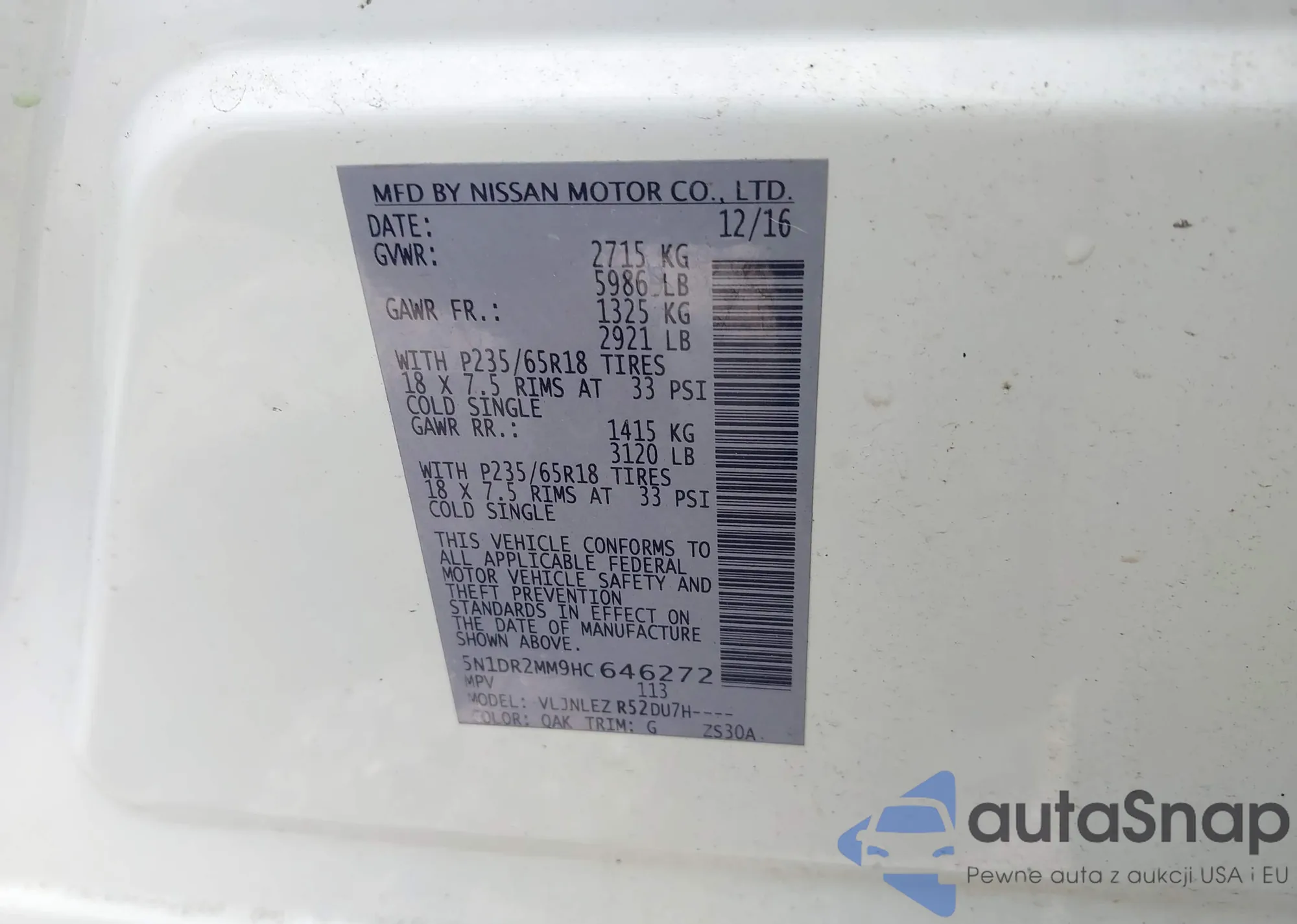 • VIN 5N1DR2MM9HC646272