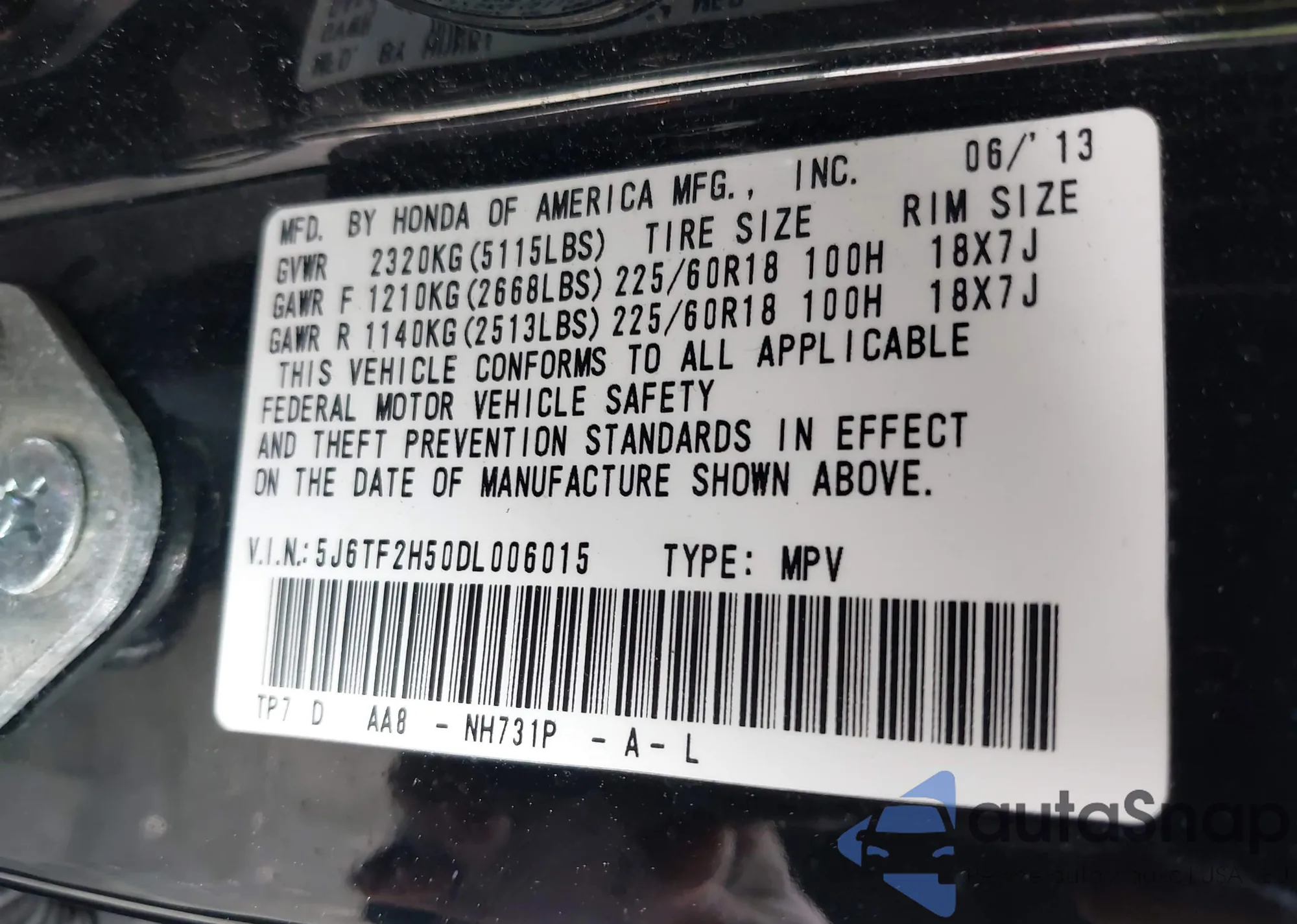• VIN 5J6TF2H50DL006015