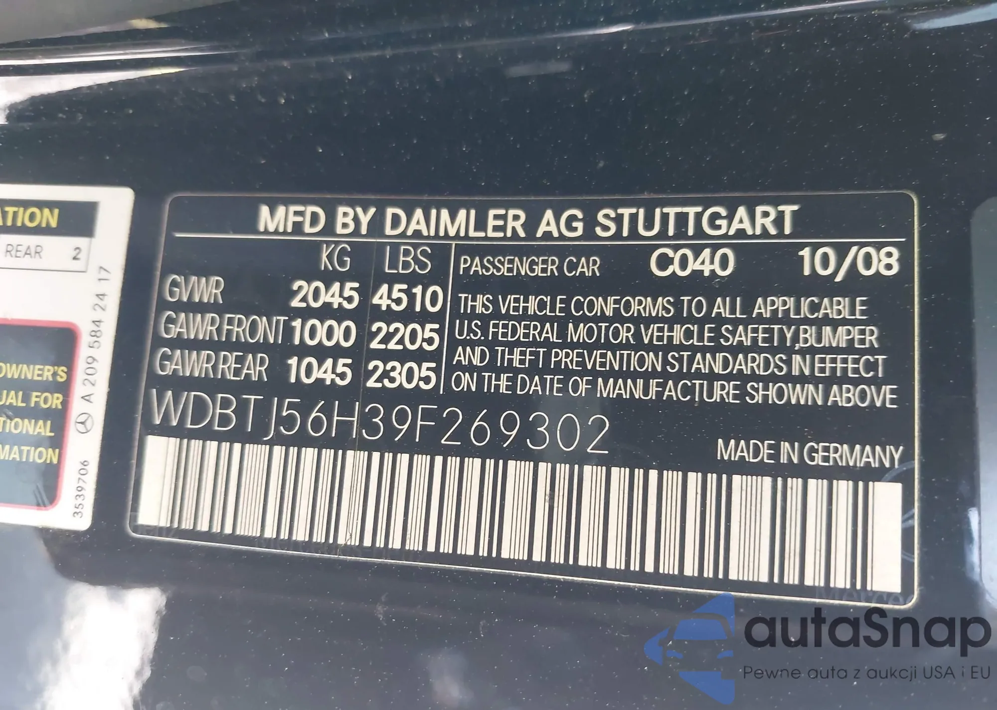 LOT: 42545246 VIN: WDBTJ56H39F269302
