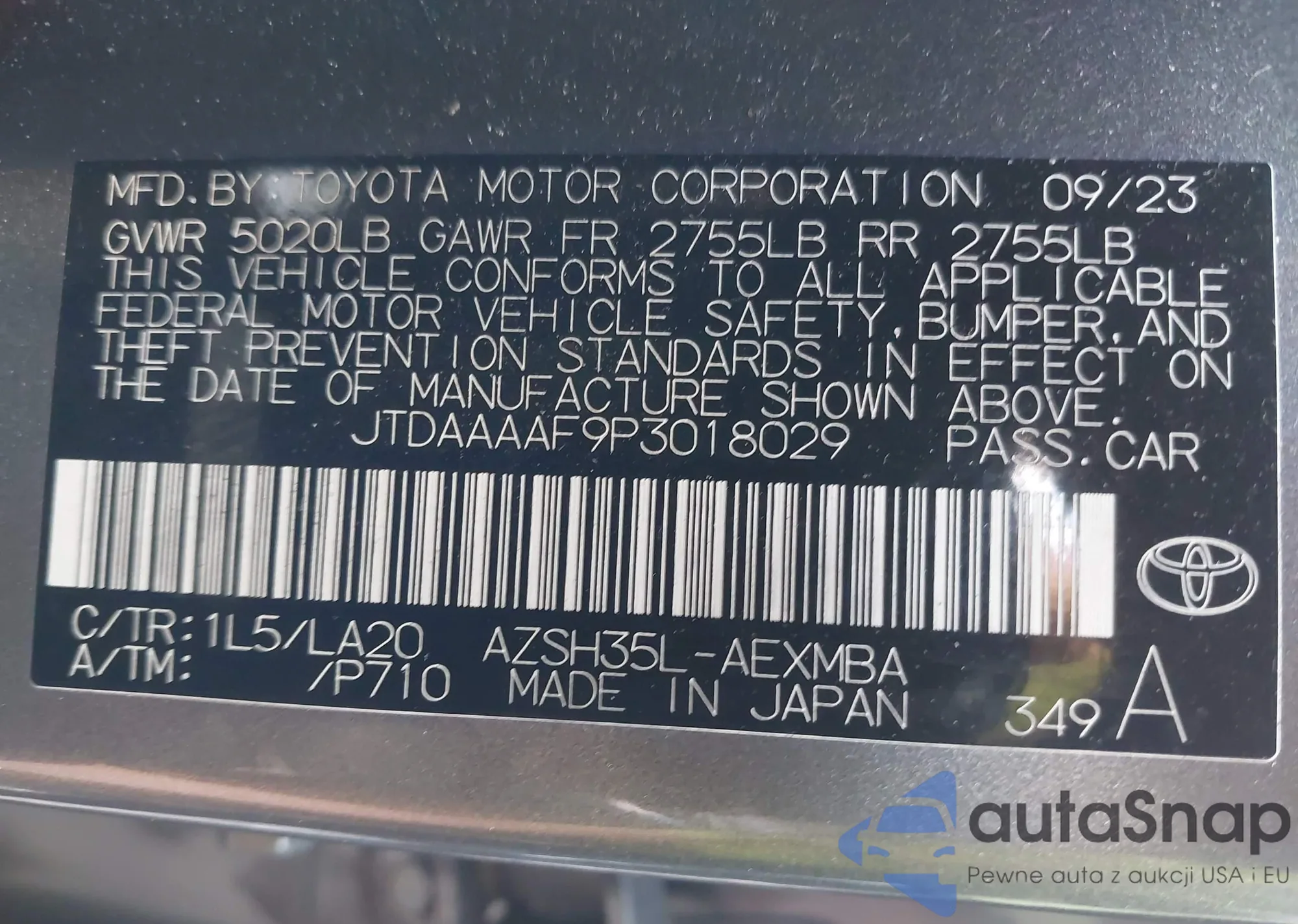 LOT: 42685853 VIN: JTDAAAAF9P3018029