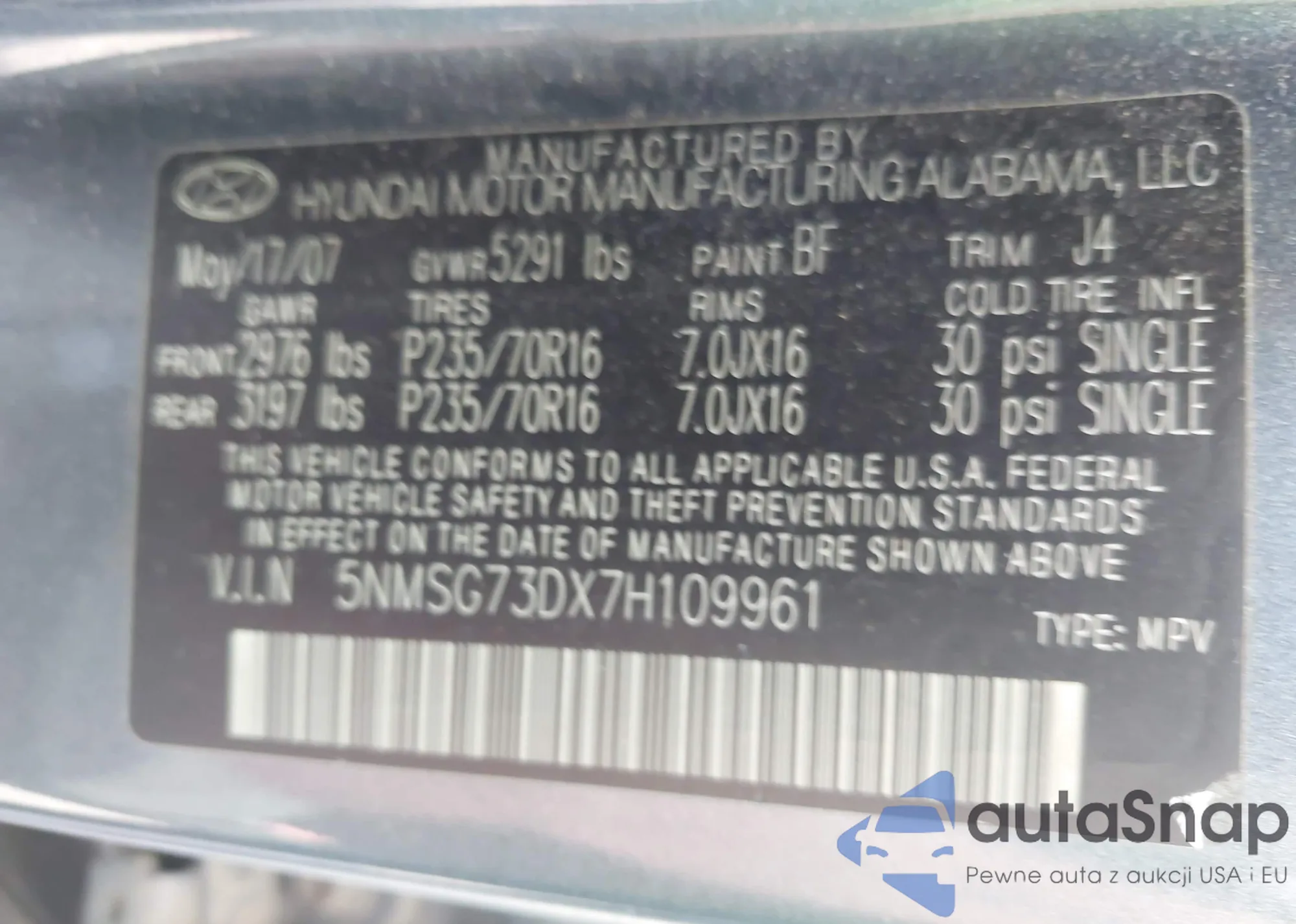 • VIN 5NMSG73DX7H109961