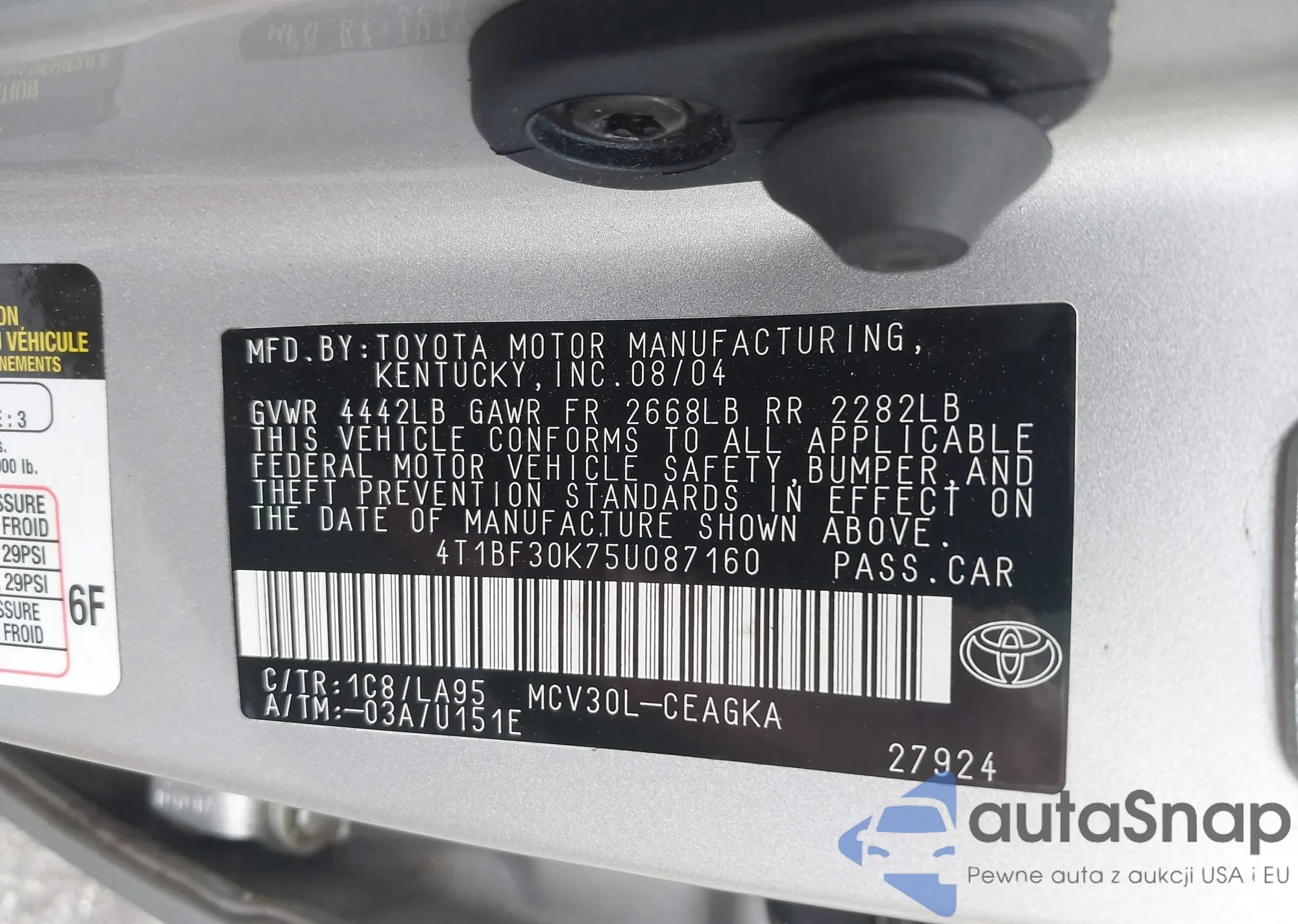 LOT: 42702272 VIN: 4T1BF30K75U087160