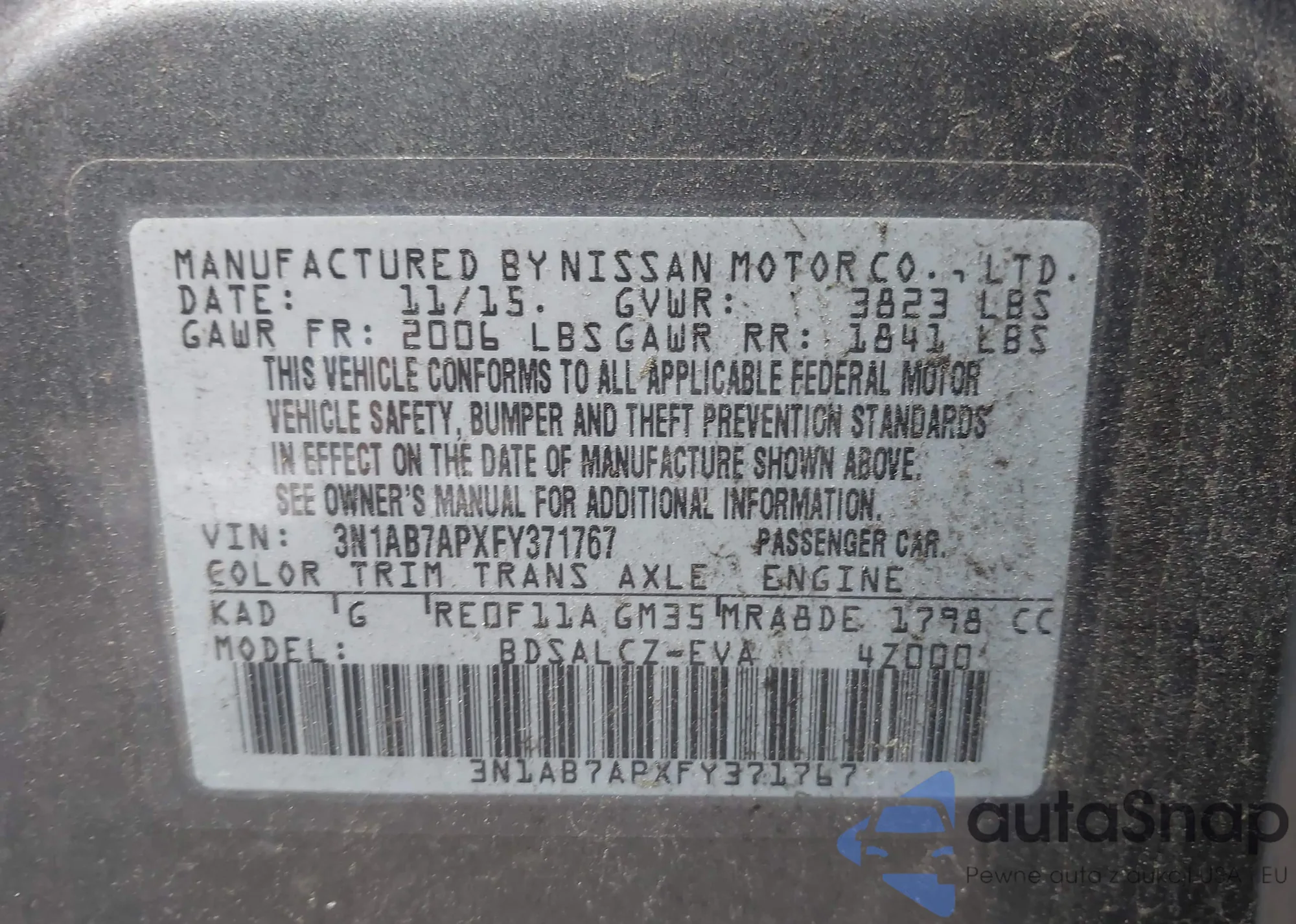 LOT: 42858560 VIN: 3N1AB7APXFY371767