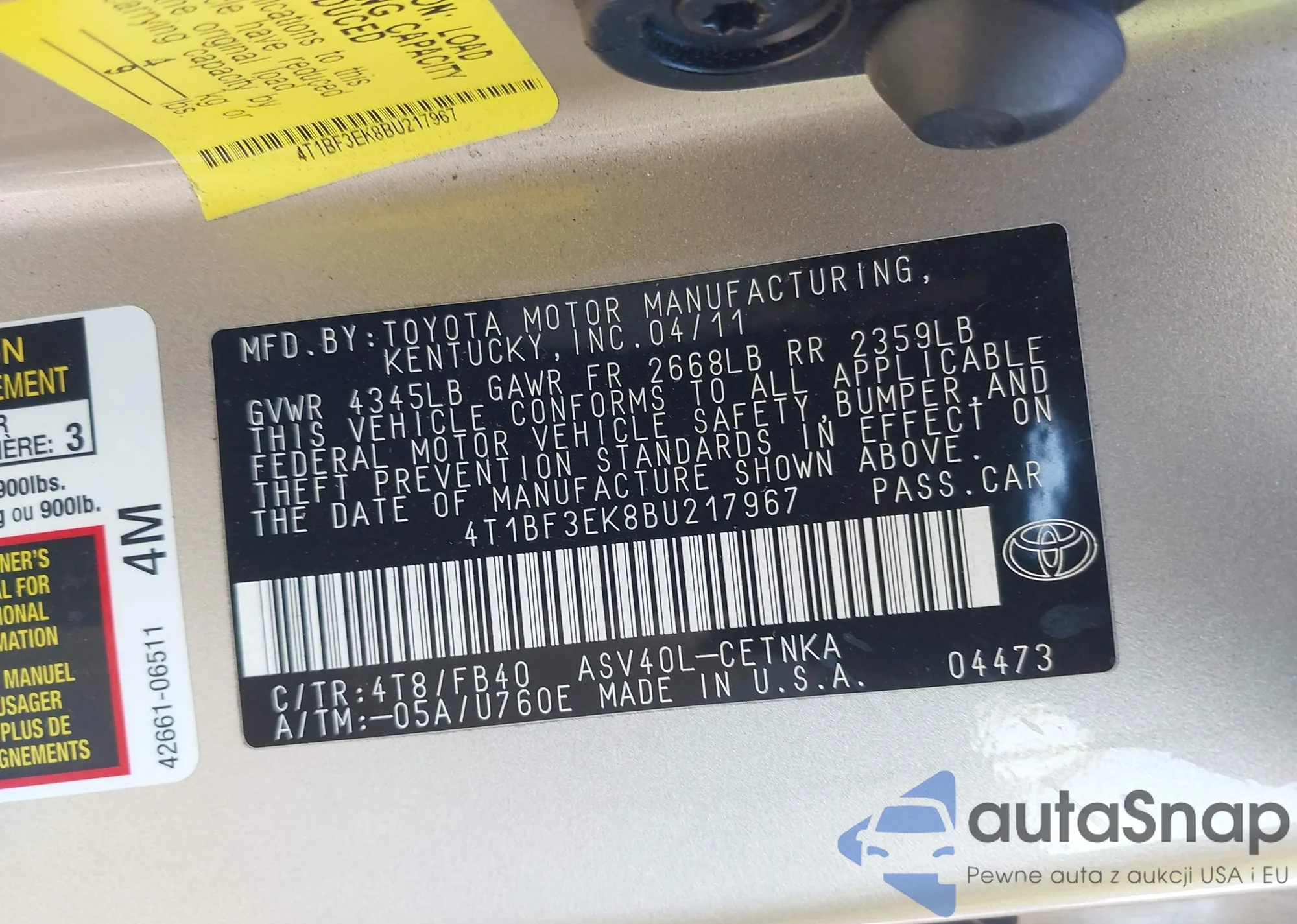 LOT: 42851789 VIN: 4T1BF3EK8BU217967