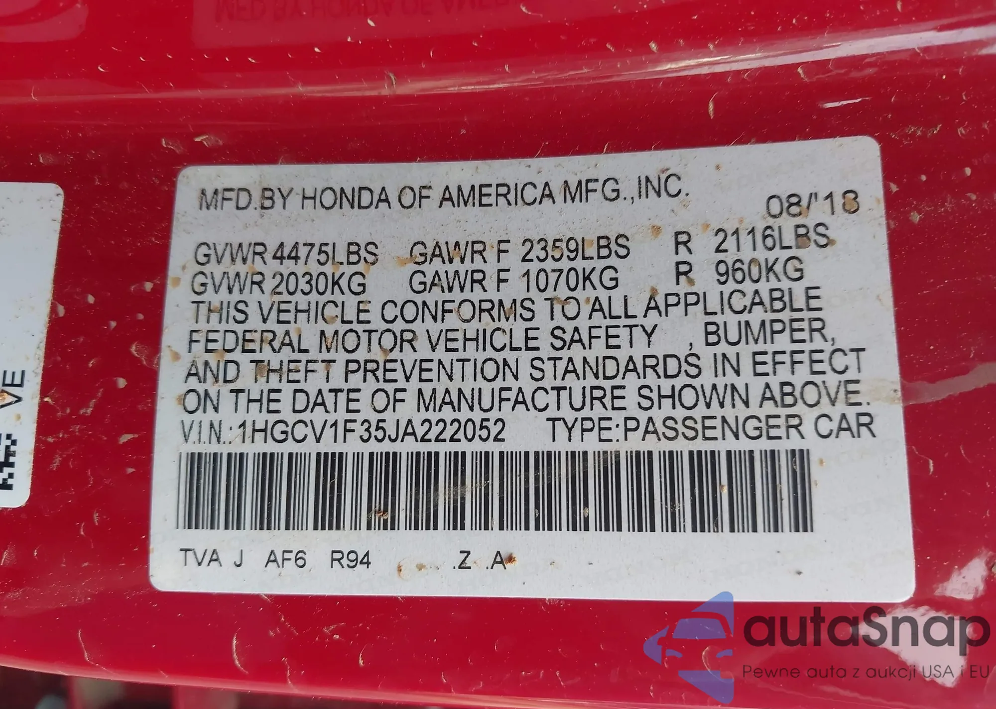 LOT: 42369462 VIN: 1HGCV1F35JA222052