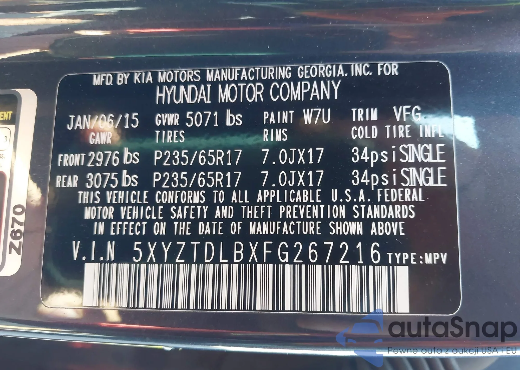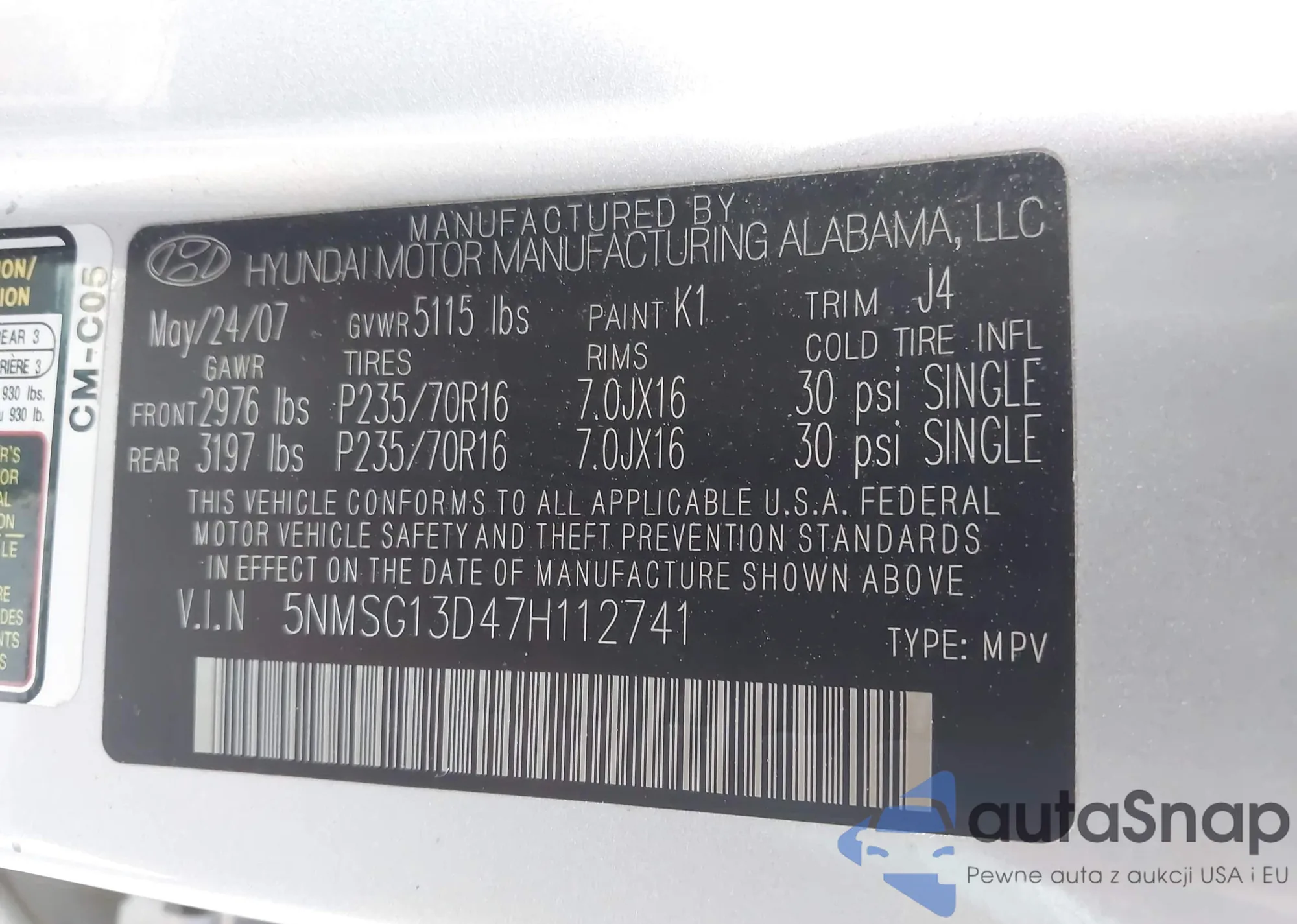 LOT: 42872016 VIN: 5NMSG13D47H112741