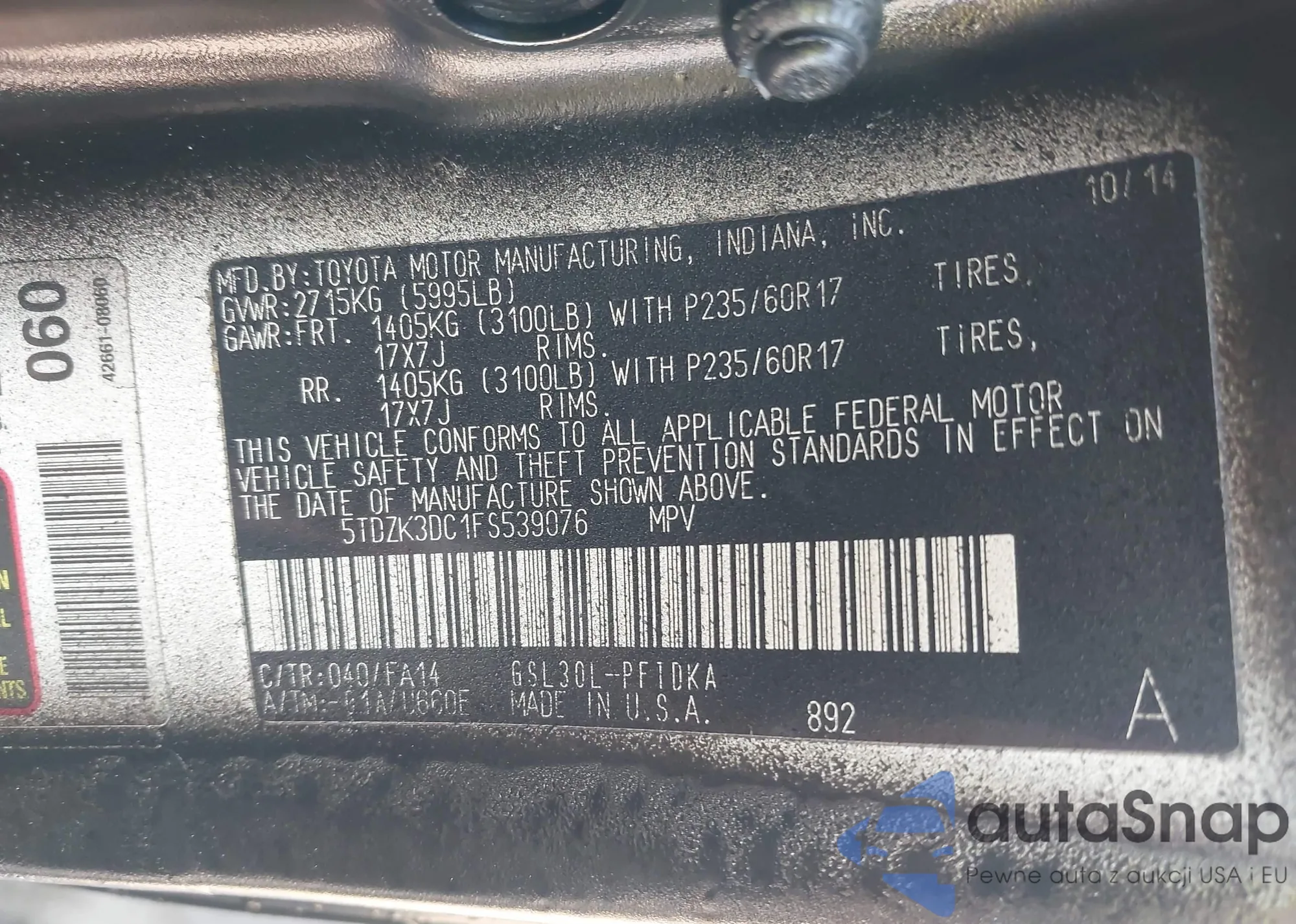 LOT: 42913036 VIN: 5TDZK3DC1FS539076