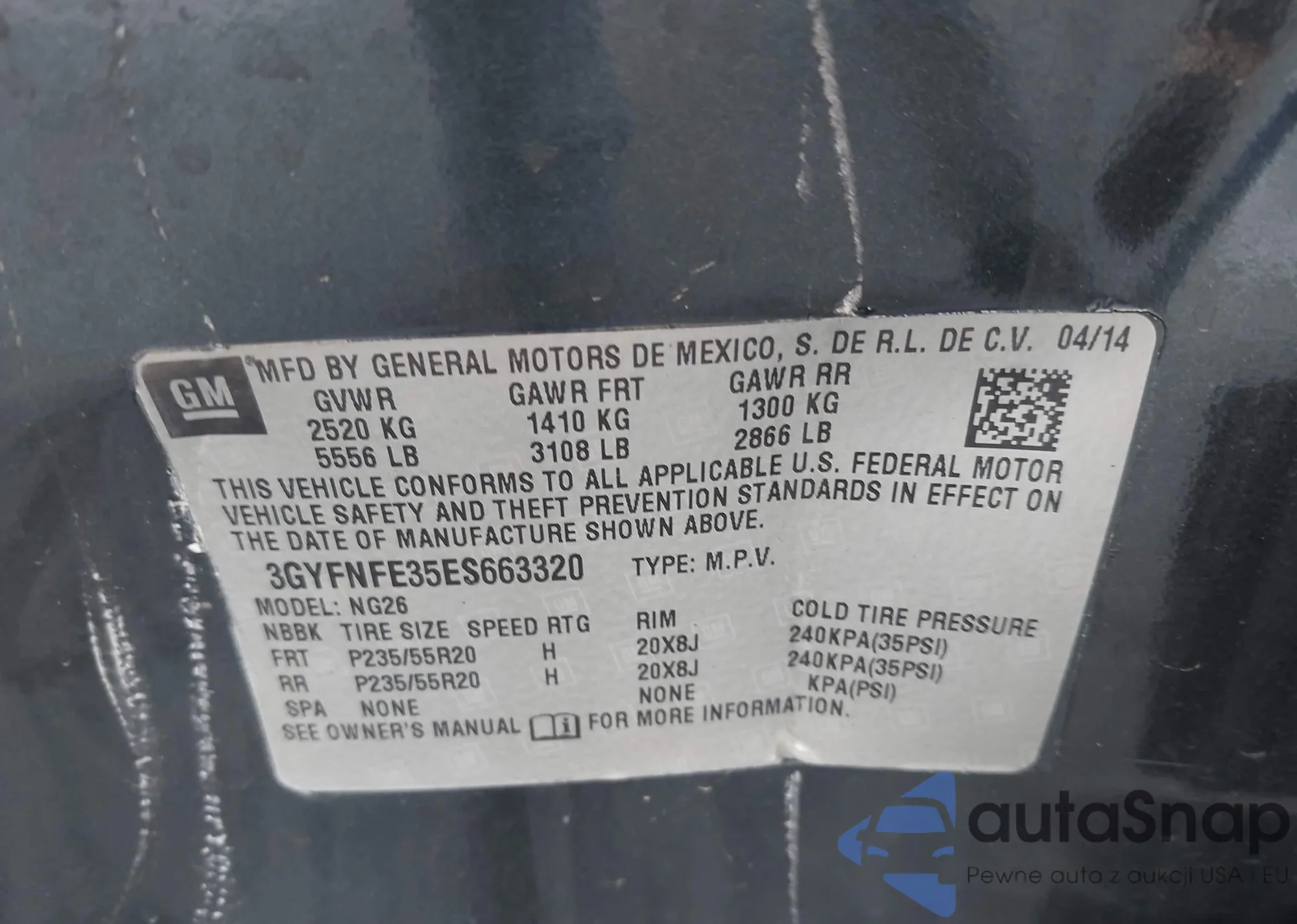 LOT: 42480235 VIN: 3GYFNFE35ES663320
