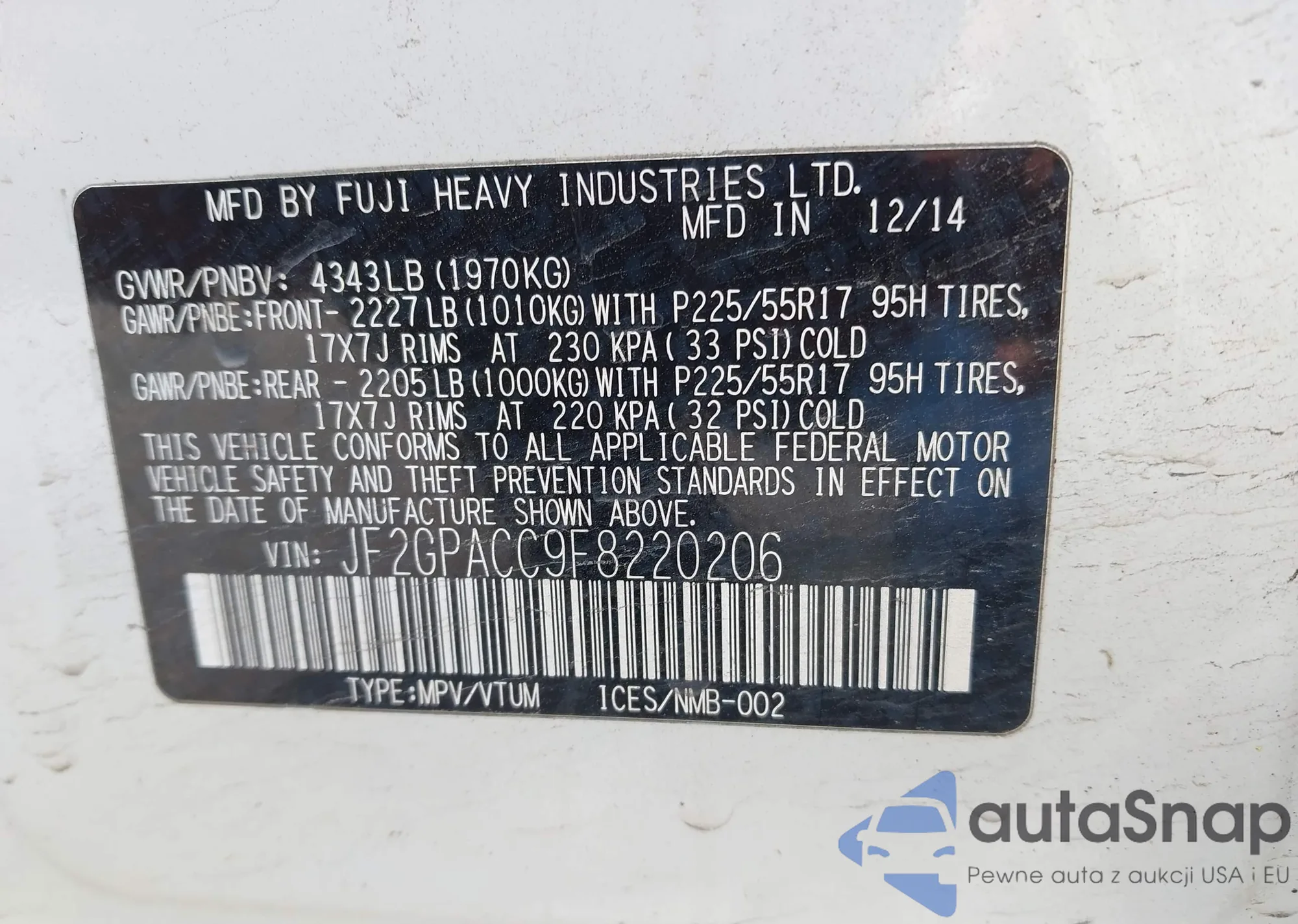 LOT: 42794900 VIN: JF2SJAWC6HH436816