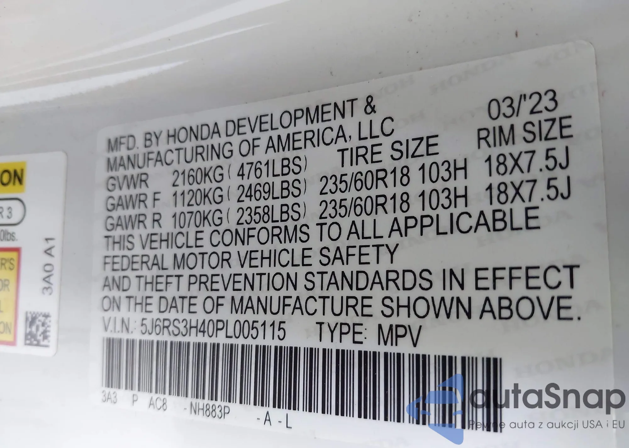 • VIN 5J6RS3H40PL005115