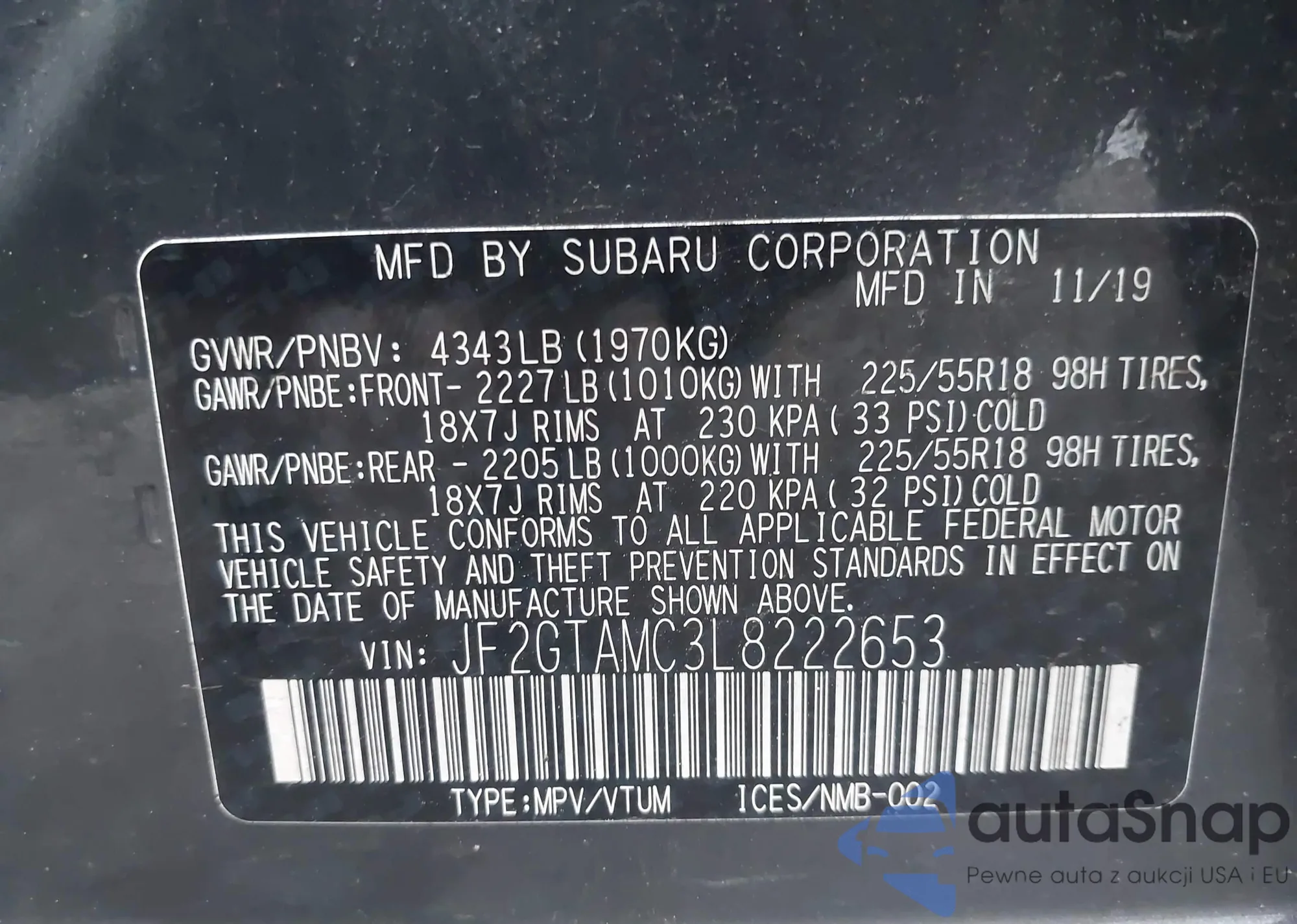 LOT: 42734565 VIN: JF2GTAMC3L8222653