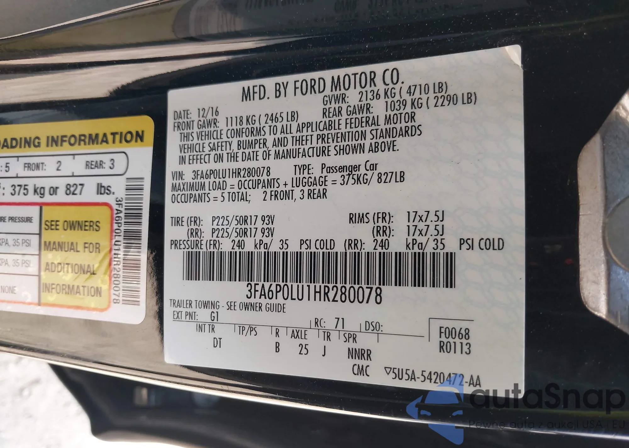 LOT: 42415273 VIN: 3FA6P0LU1HR280078