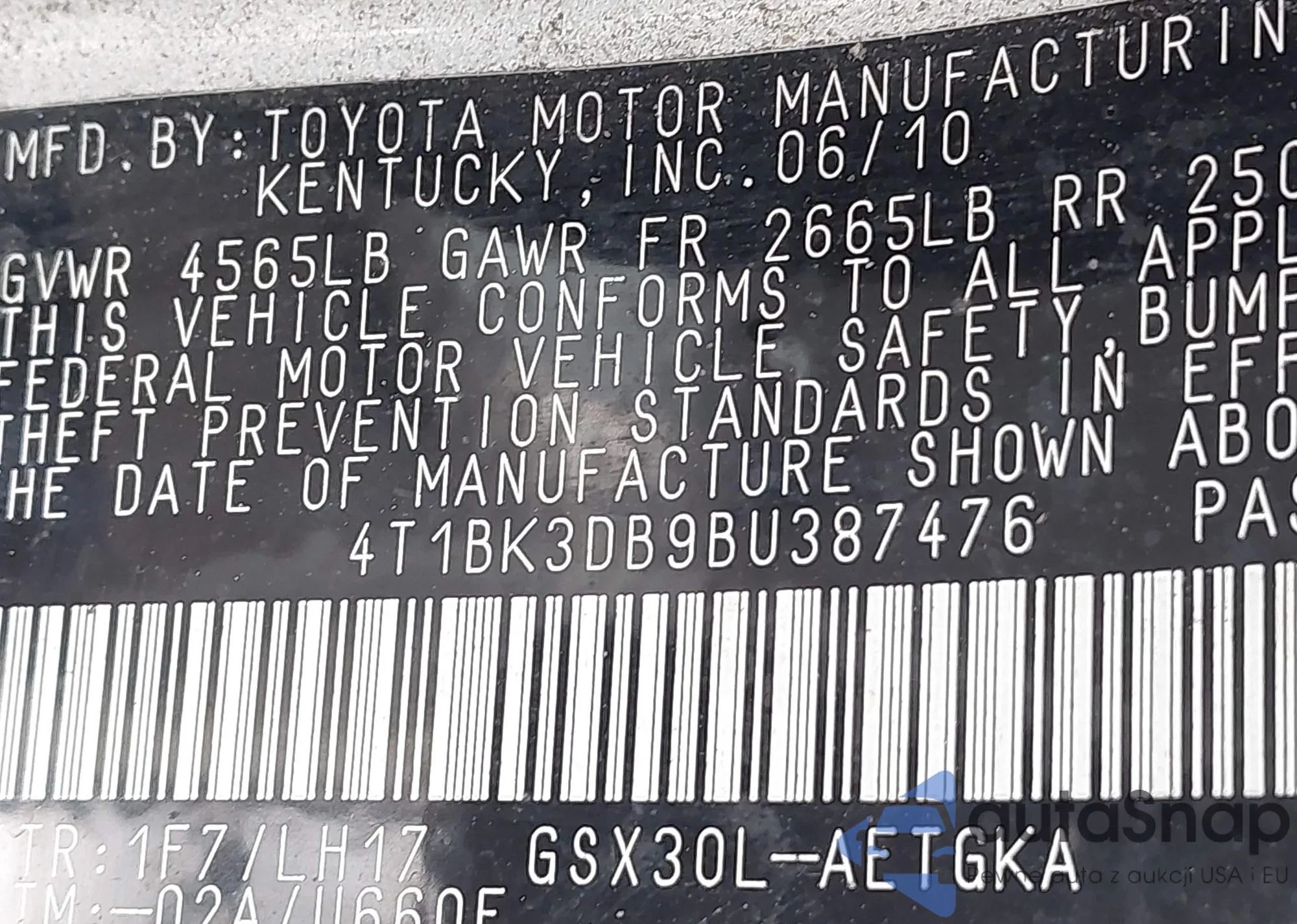 • VIN 4T1BK3DB9BU387476