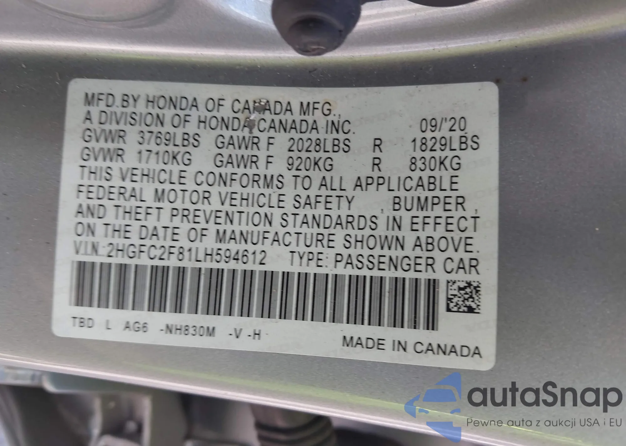 • VIN 2HGFC2F81LH594612