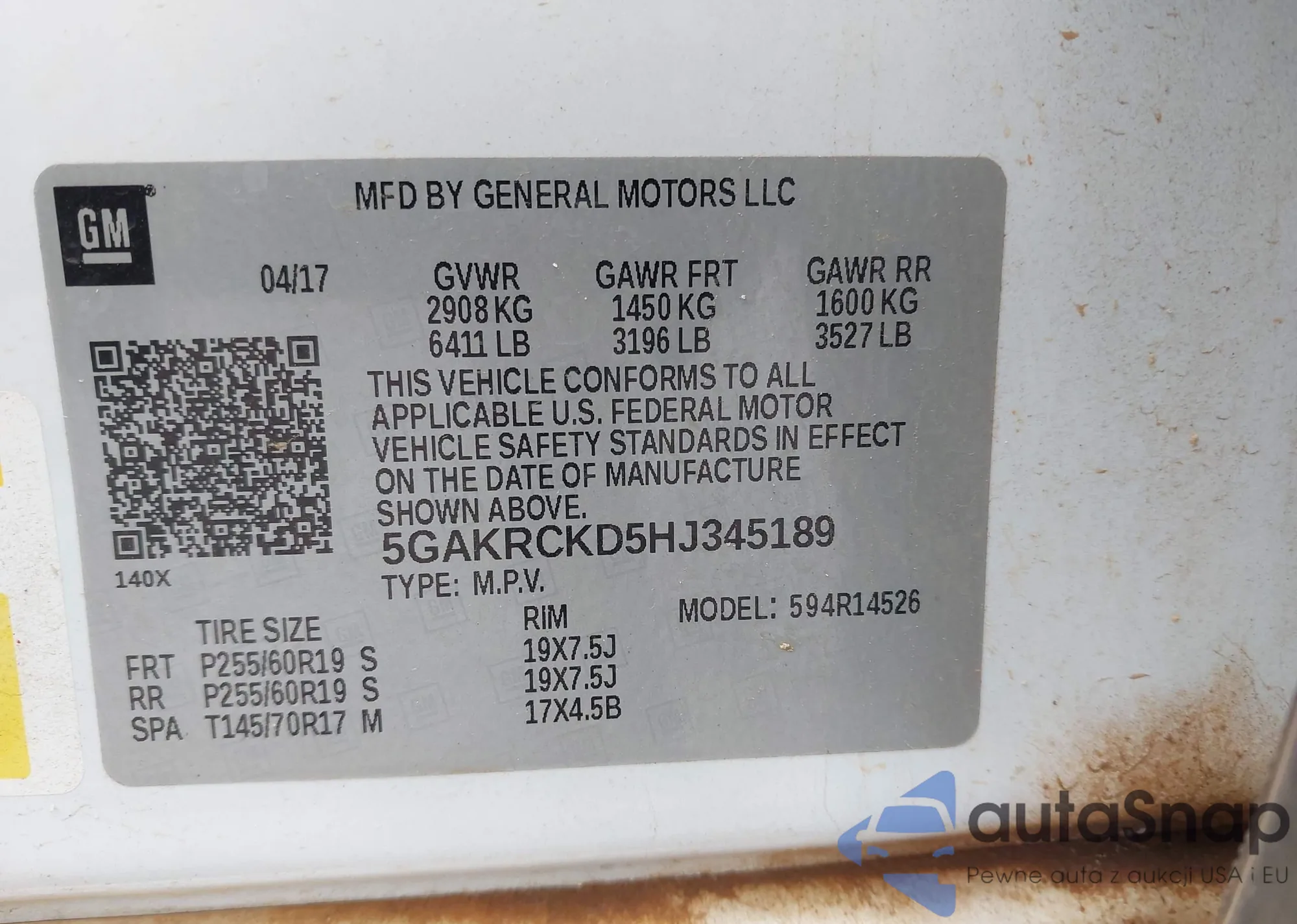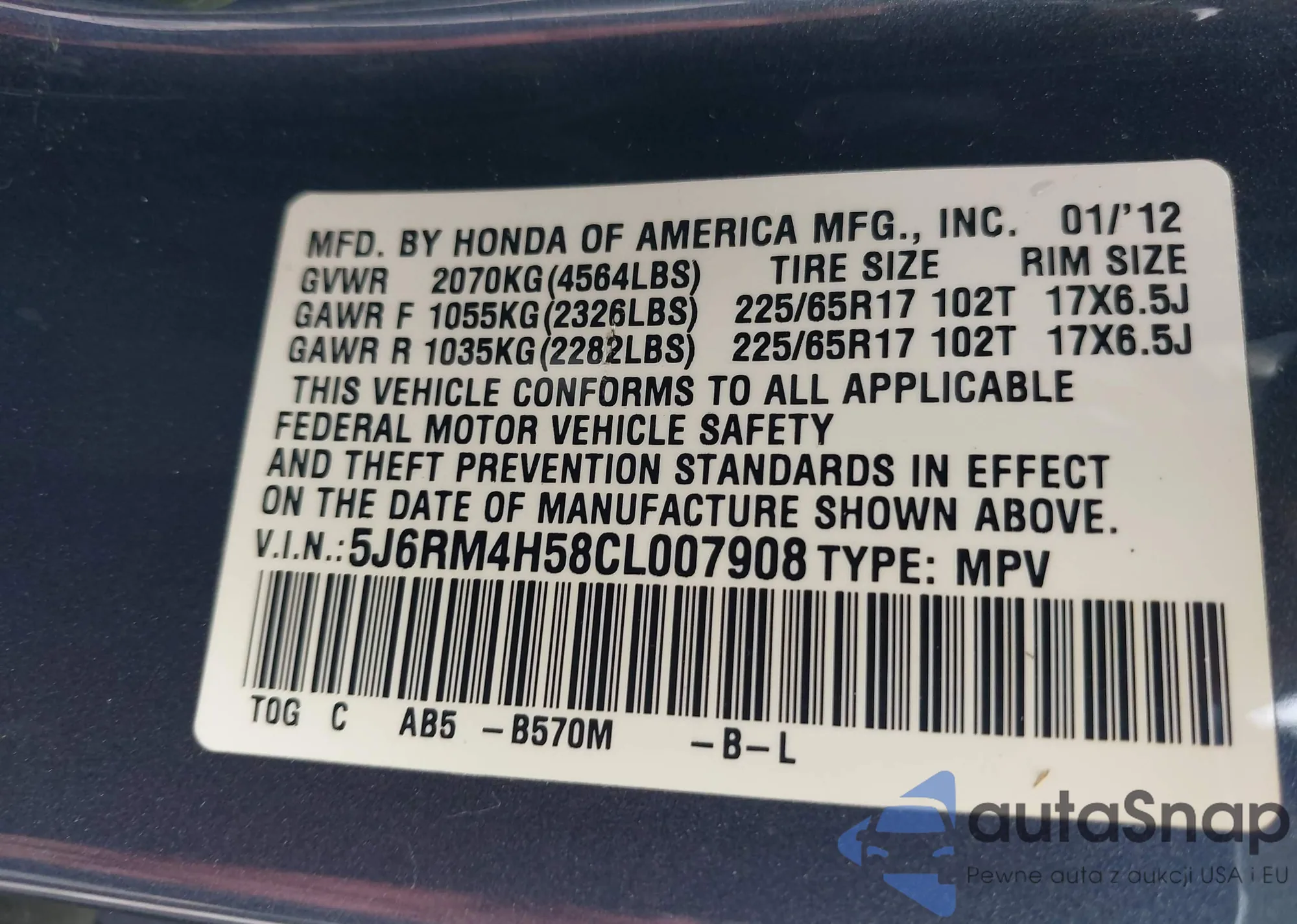 • VIN 5J6RM4H58CL007908