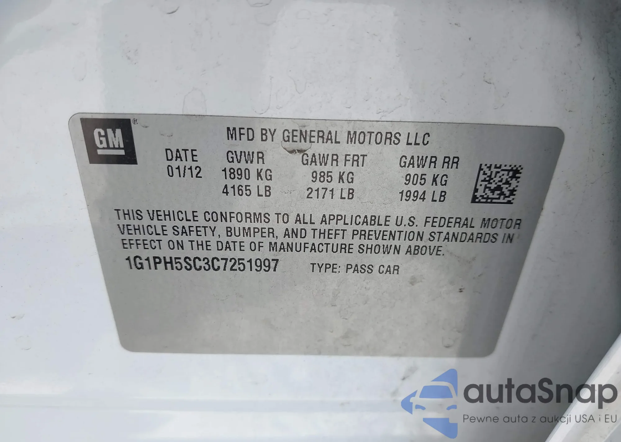 LOT: 42852922 VIN: 1G1PH5SC3C7251997