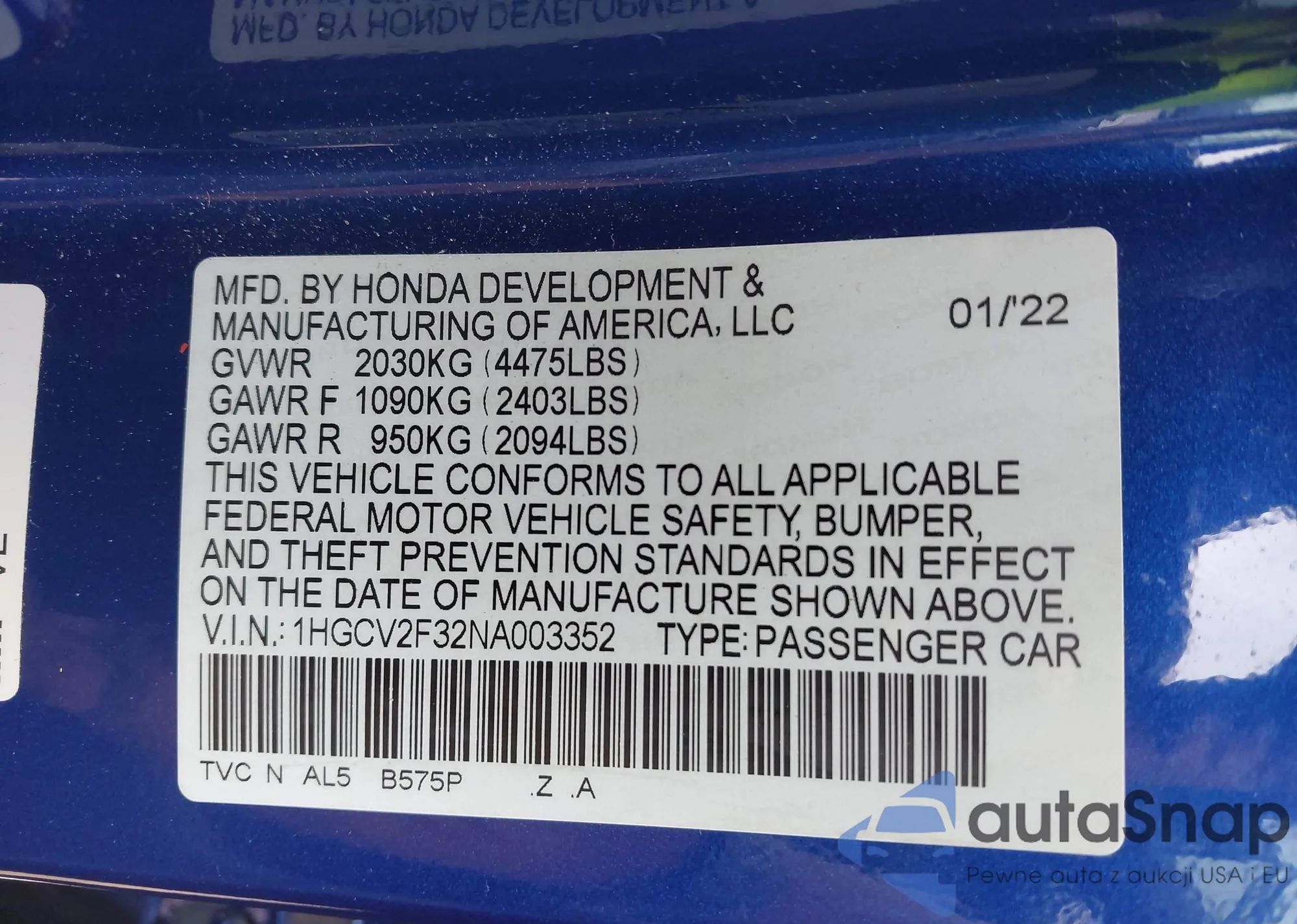 LOT: 42468880 VIN: 1HGCV2F32NA003352