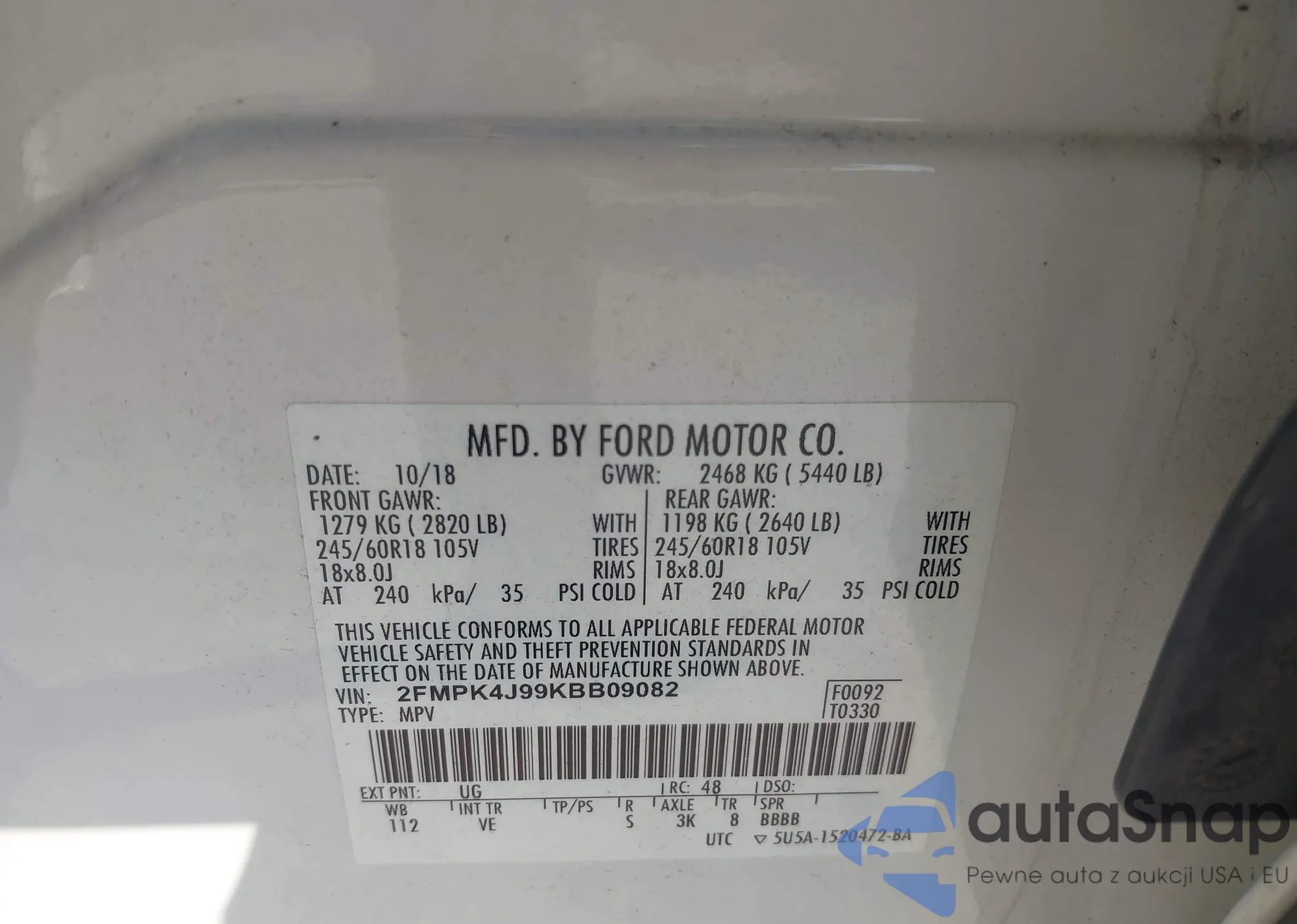 LOT: 42841161 VIN: 2FMPK4J99KBB09082