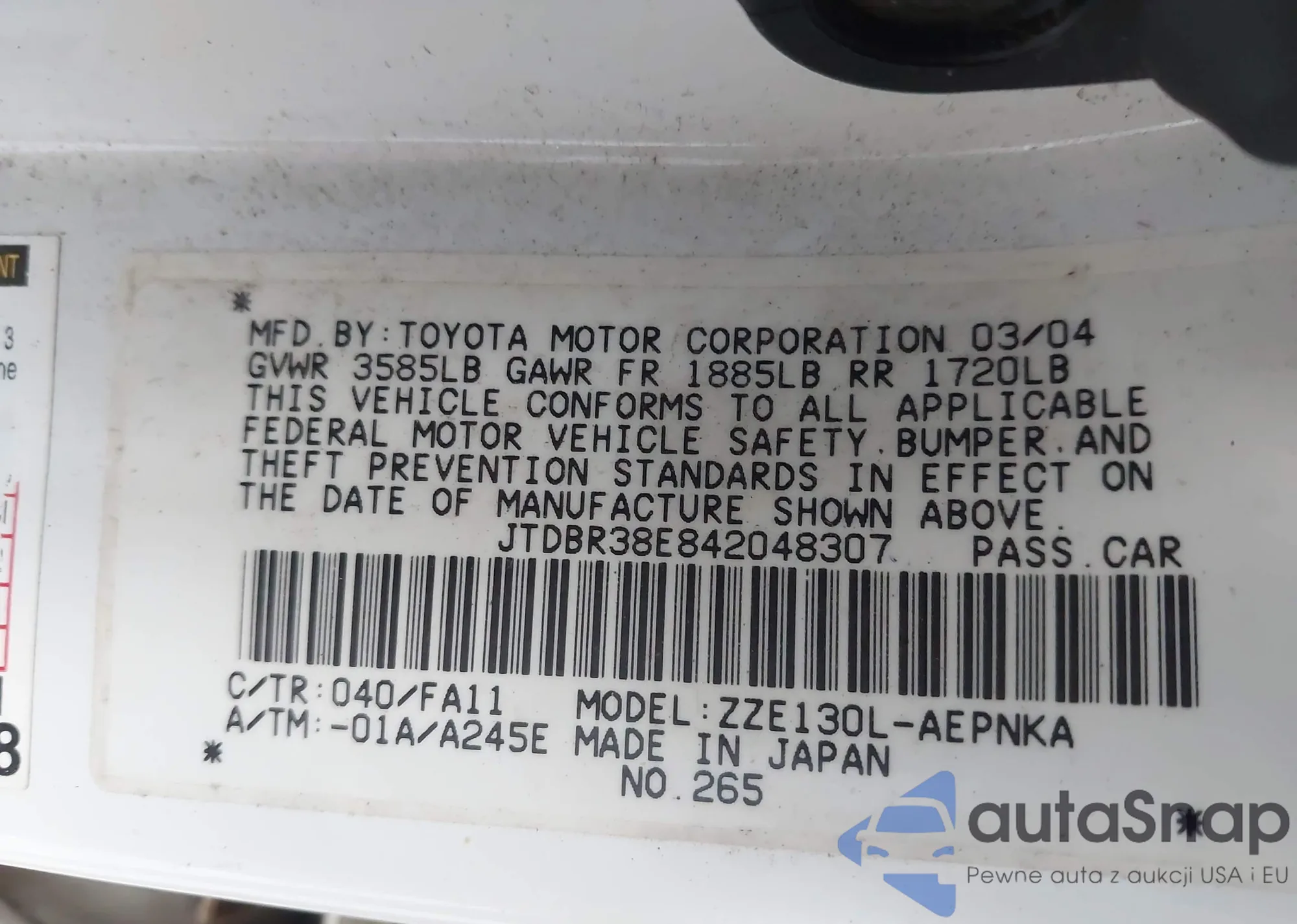 LOT: 42610297 VIN: JTDBR38E842048307