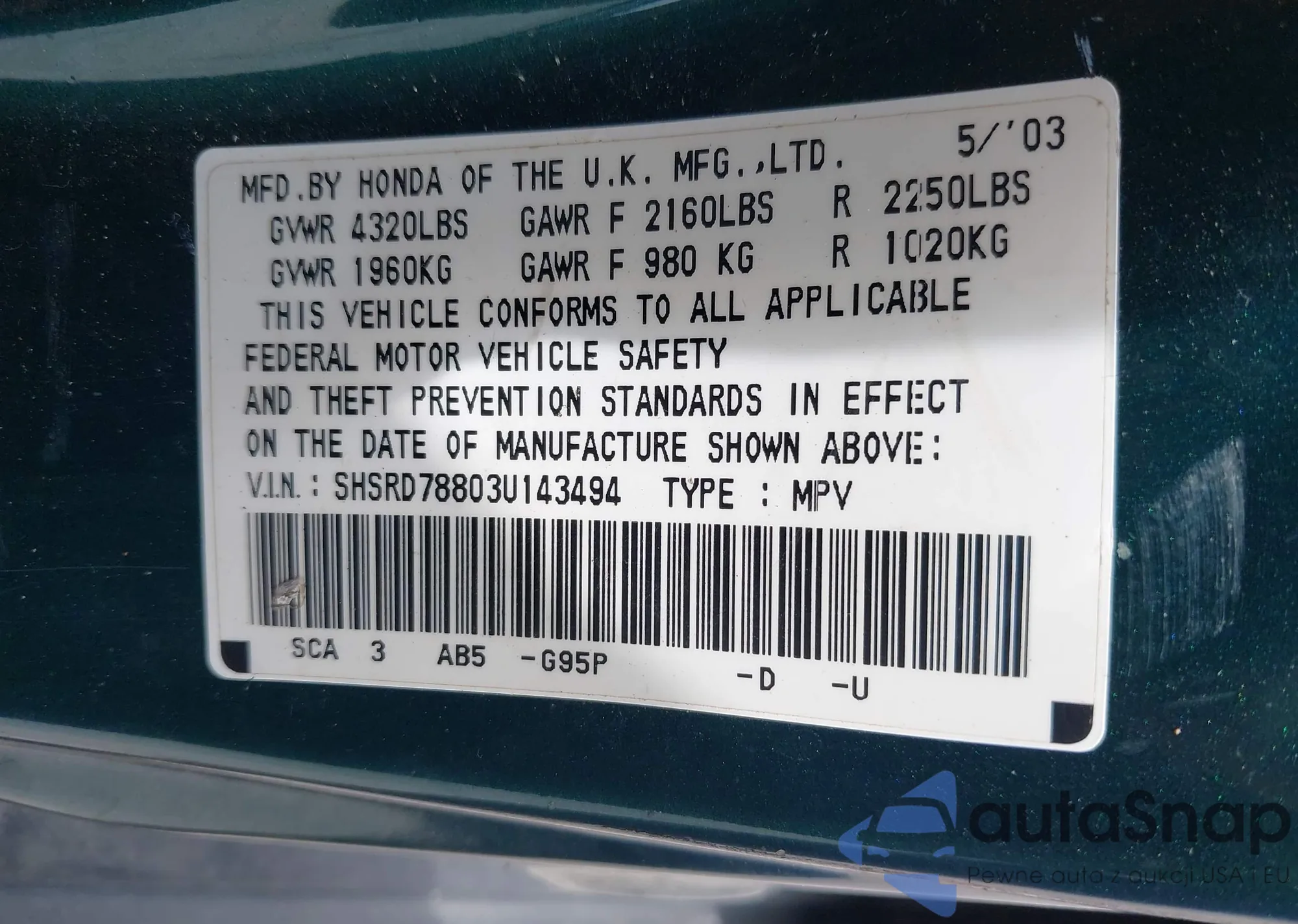 • VIN SHSRD78803U143494