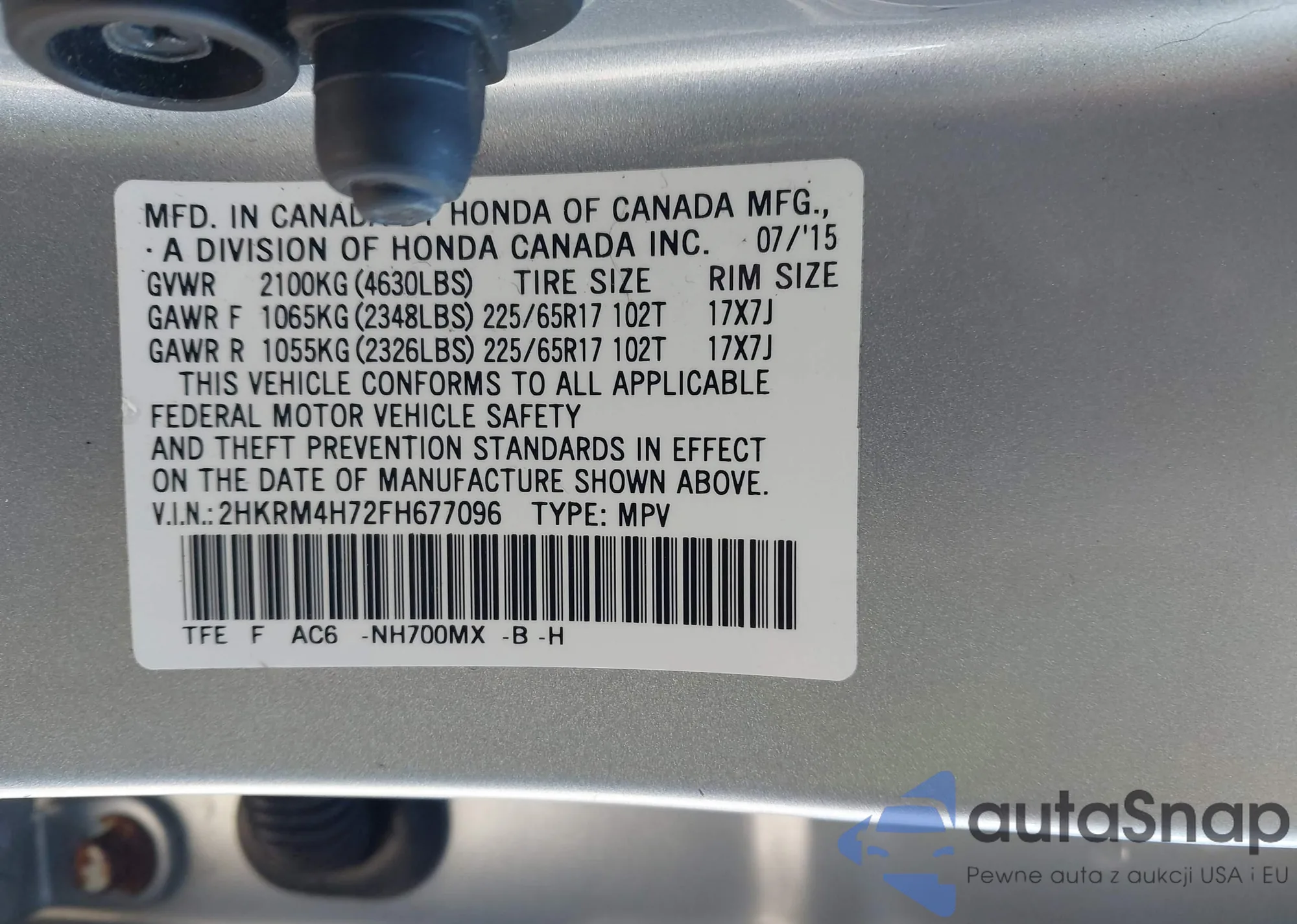 • VIN 2HKRM4H72FH677096
