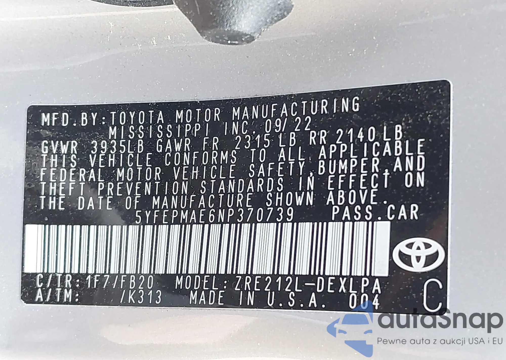 LOT: 42191745 VIN: 5YFEPMAE6NP370739