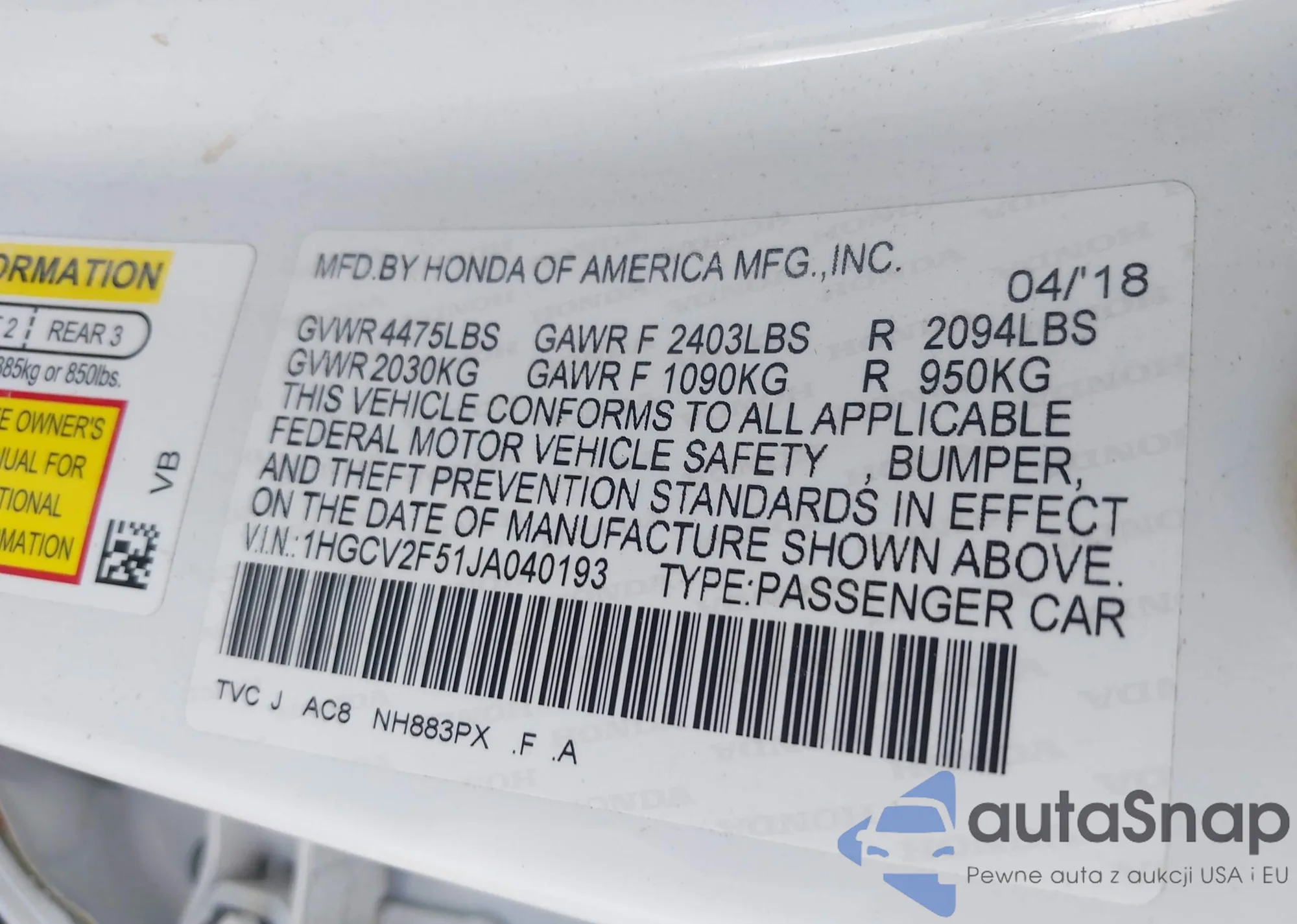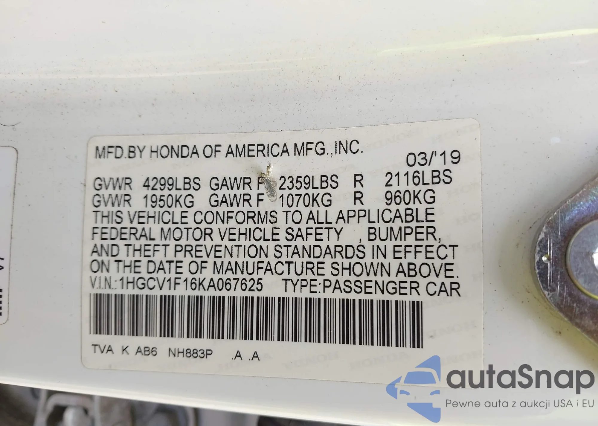 LOT: 42042470 VIN: 1HGCV1F14MA046260