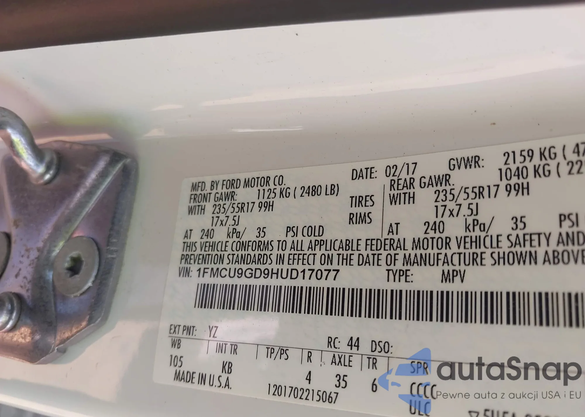 LOT: 42669714 VIN: 1FMCU9GD9HUD17077