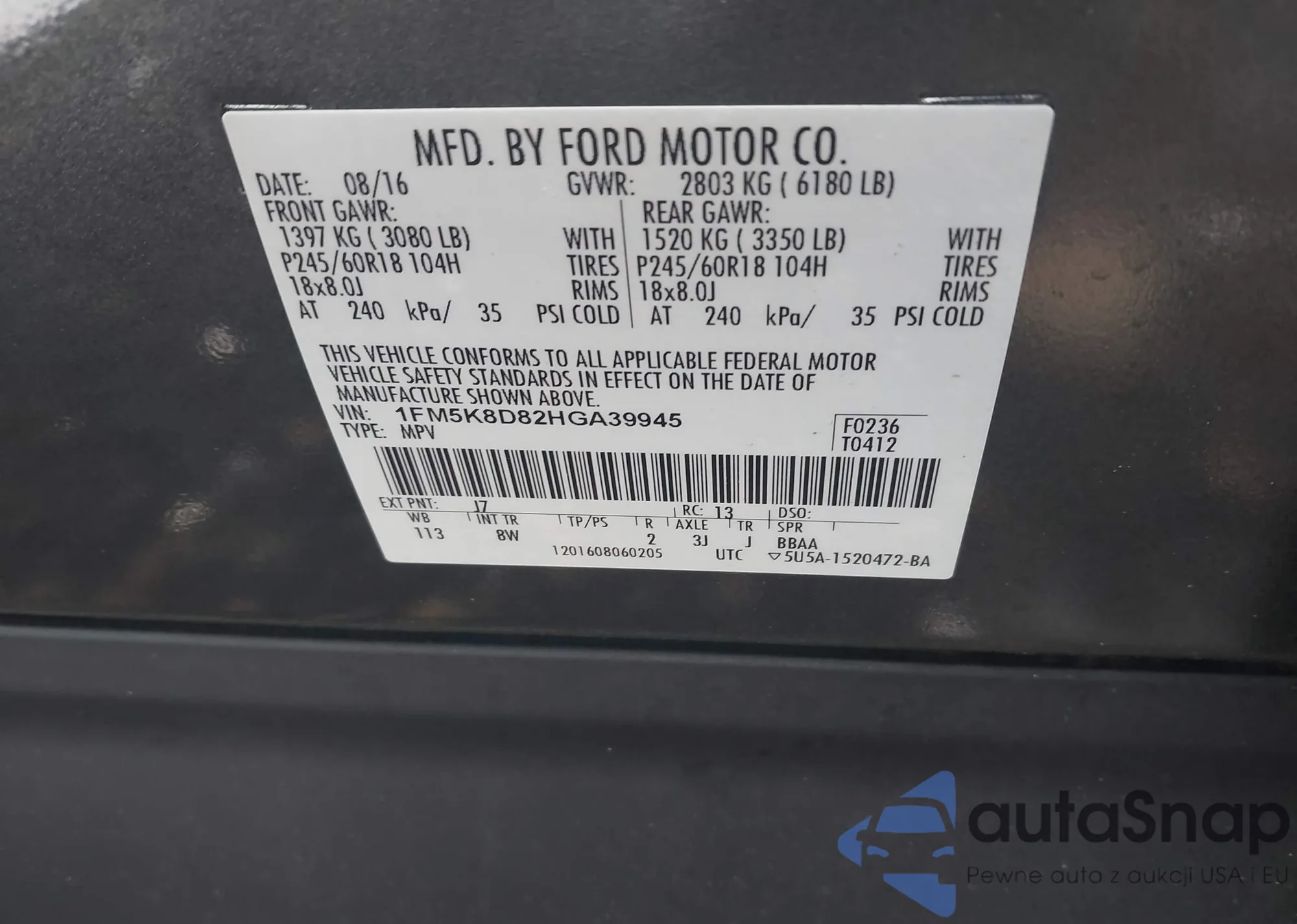 LOT: 42610326 VIN: 1FM5K8D82HGA39945