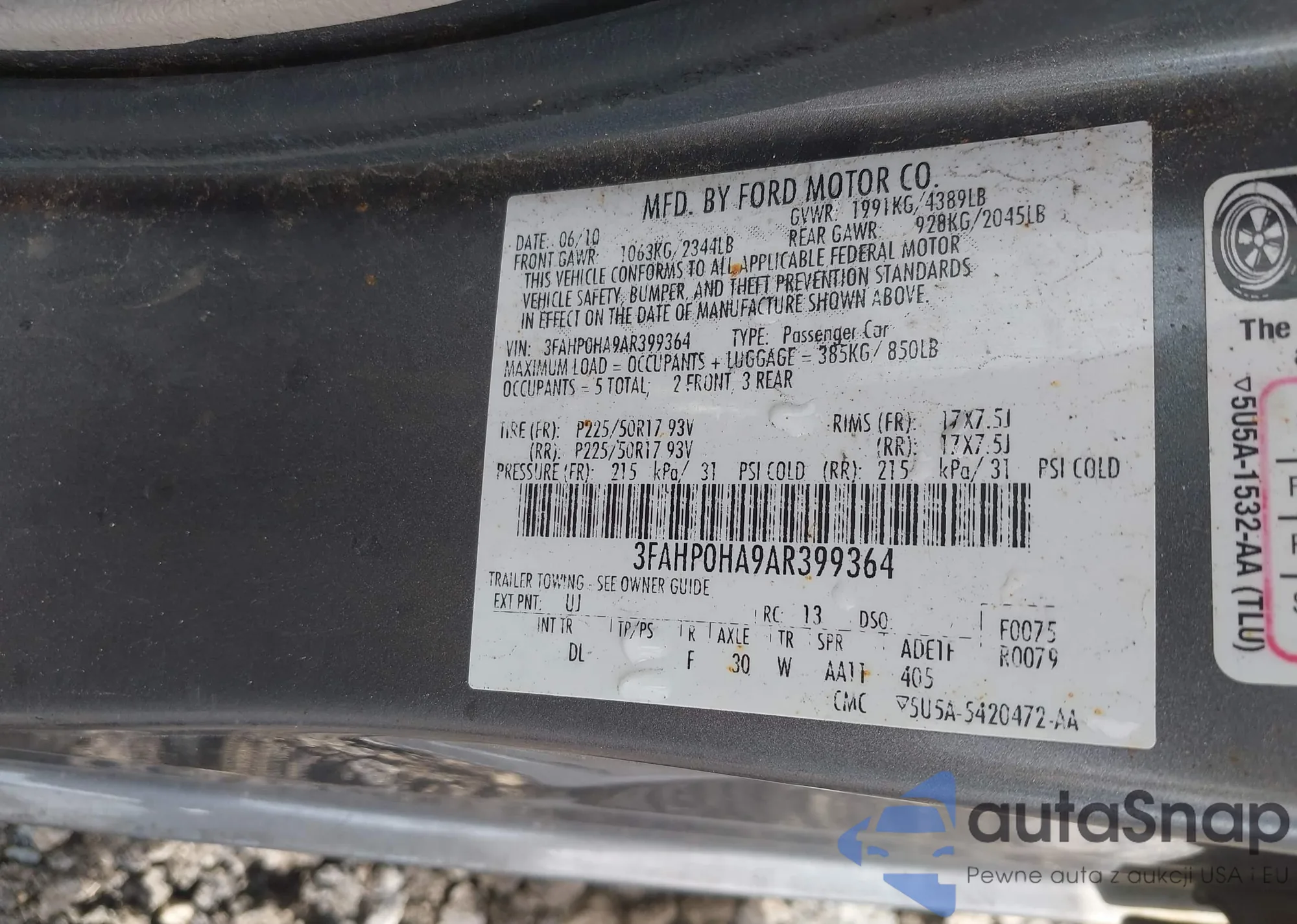 • VIN 3FAHP0HA9AR399364