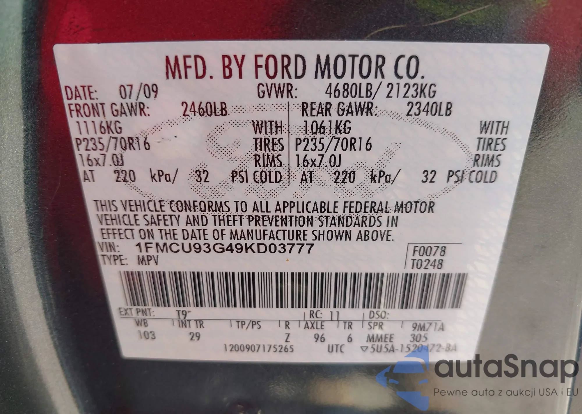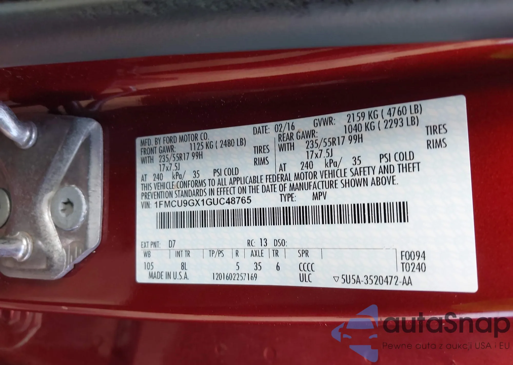 • VIN 1FMCU9GX1GUC48765