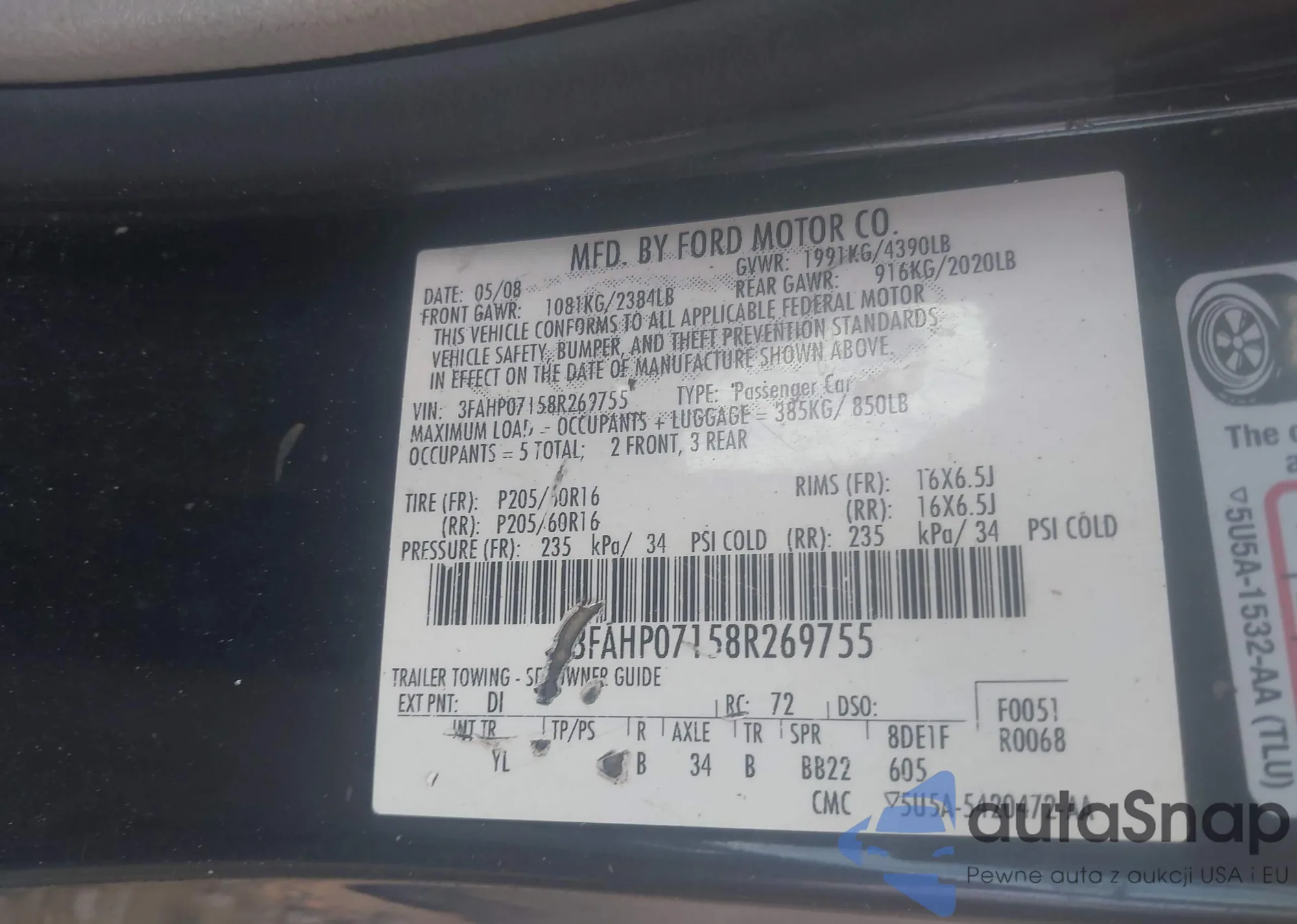 LOT: 42872324 VIN: 3FAHP07158R269755