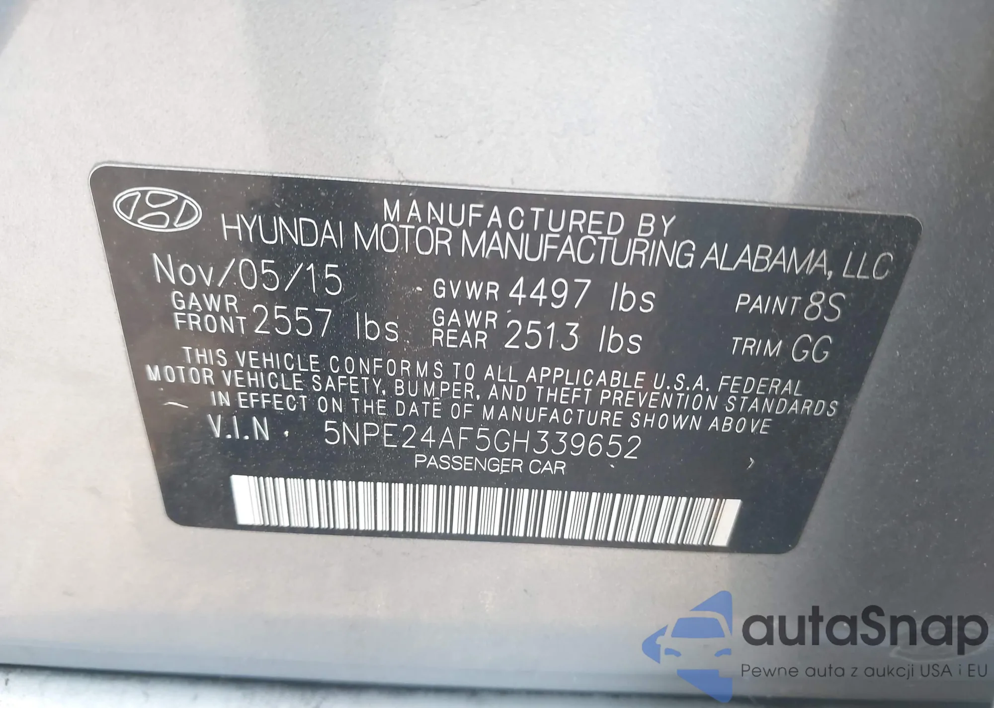 • VIN 5NPE24AF5GH339652