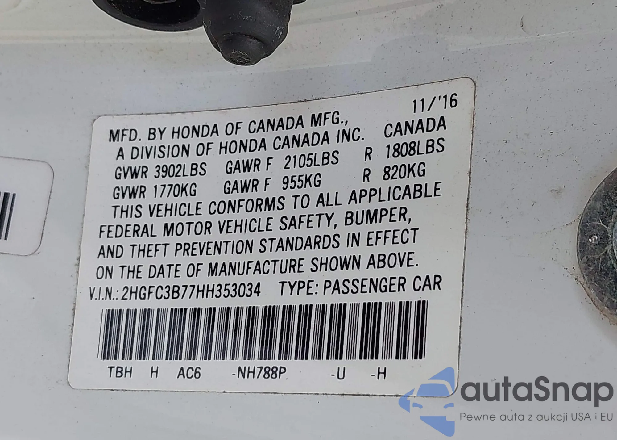 • VIN 2HGFC3B77HH353034
