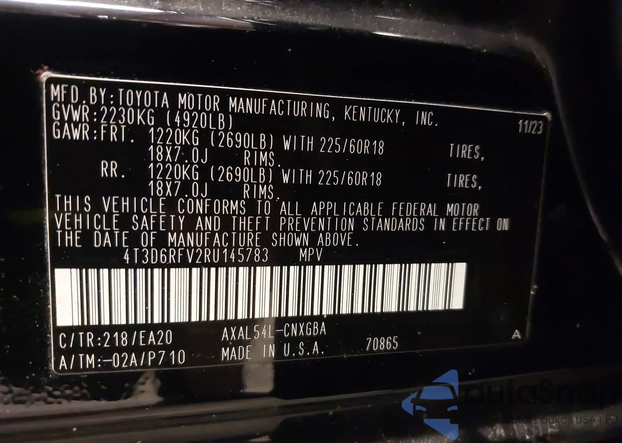 • VIN 4T3D6RFV2RU145783