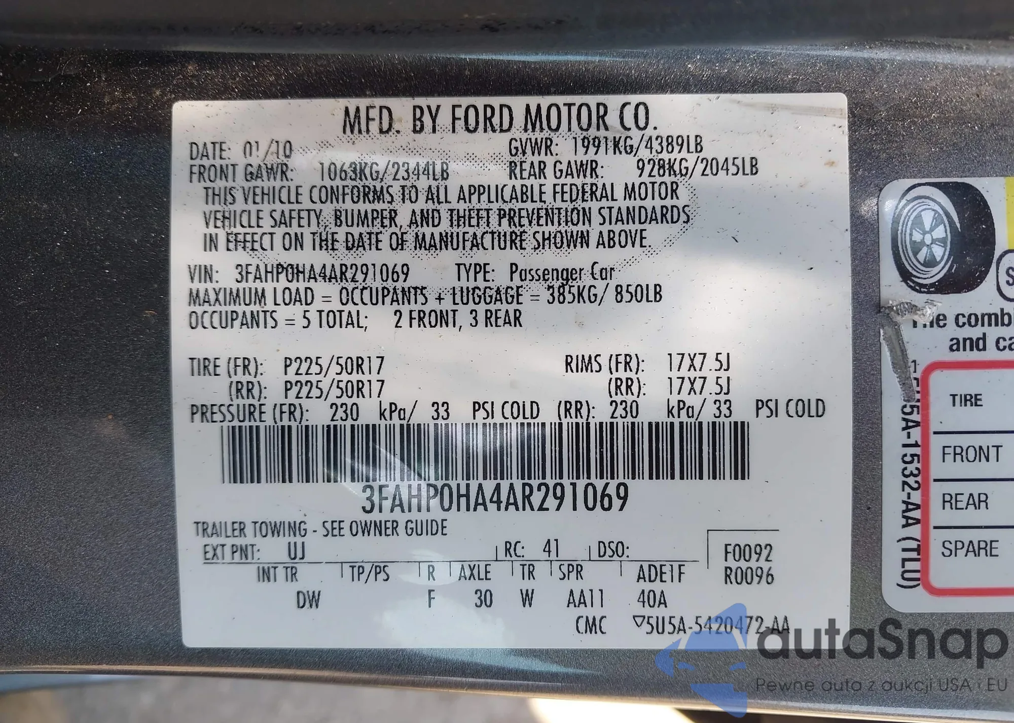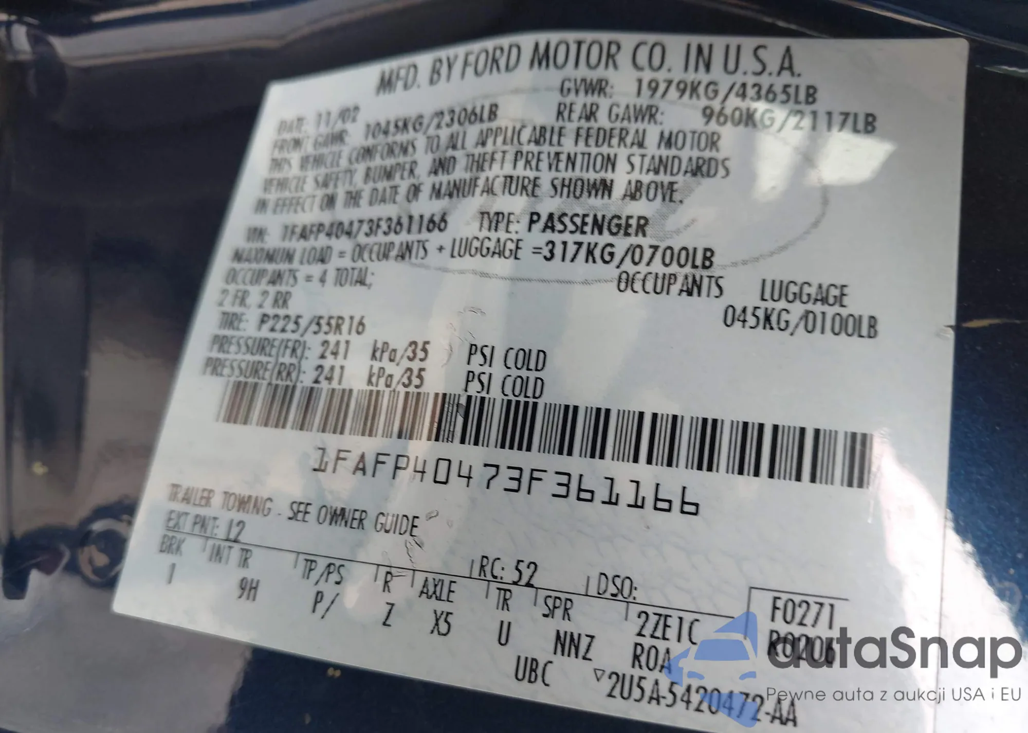 LOT: 42616536 VIN: 1FAFP40473F361166
