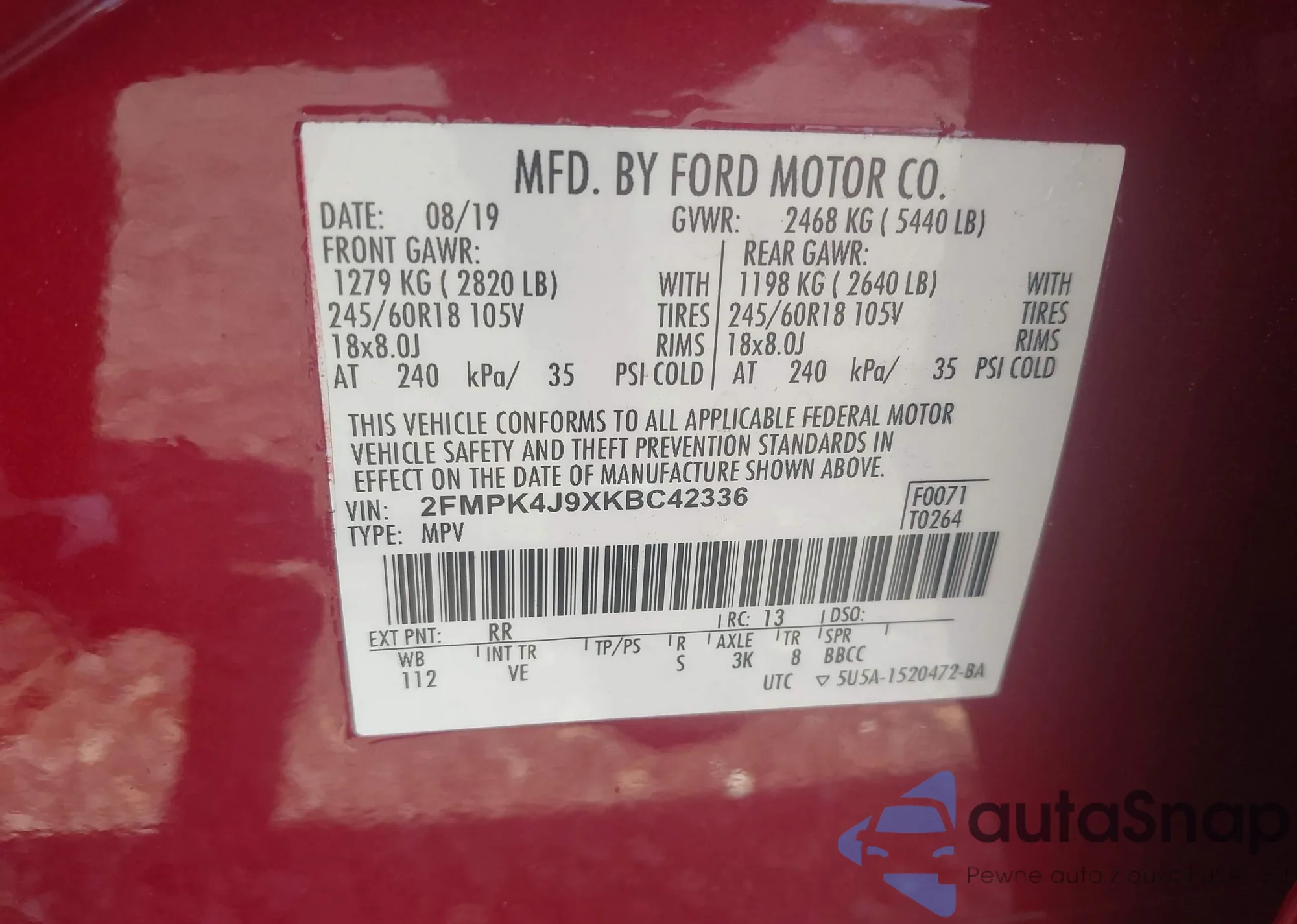 LOT: 42717147 VIN: 1FMCU0G98FUB45807