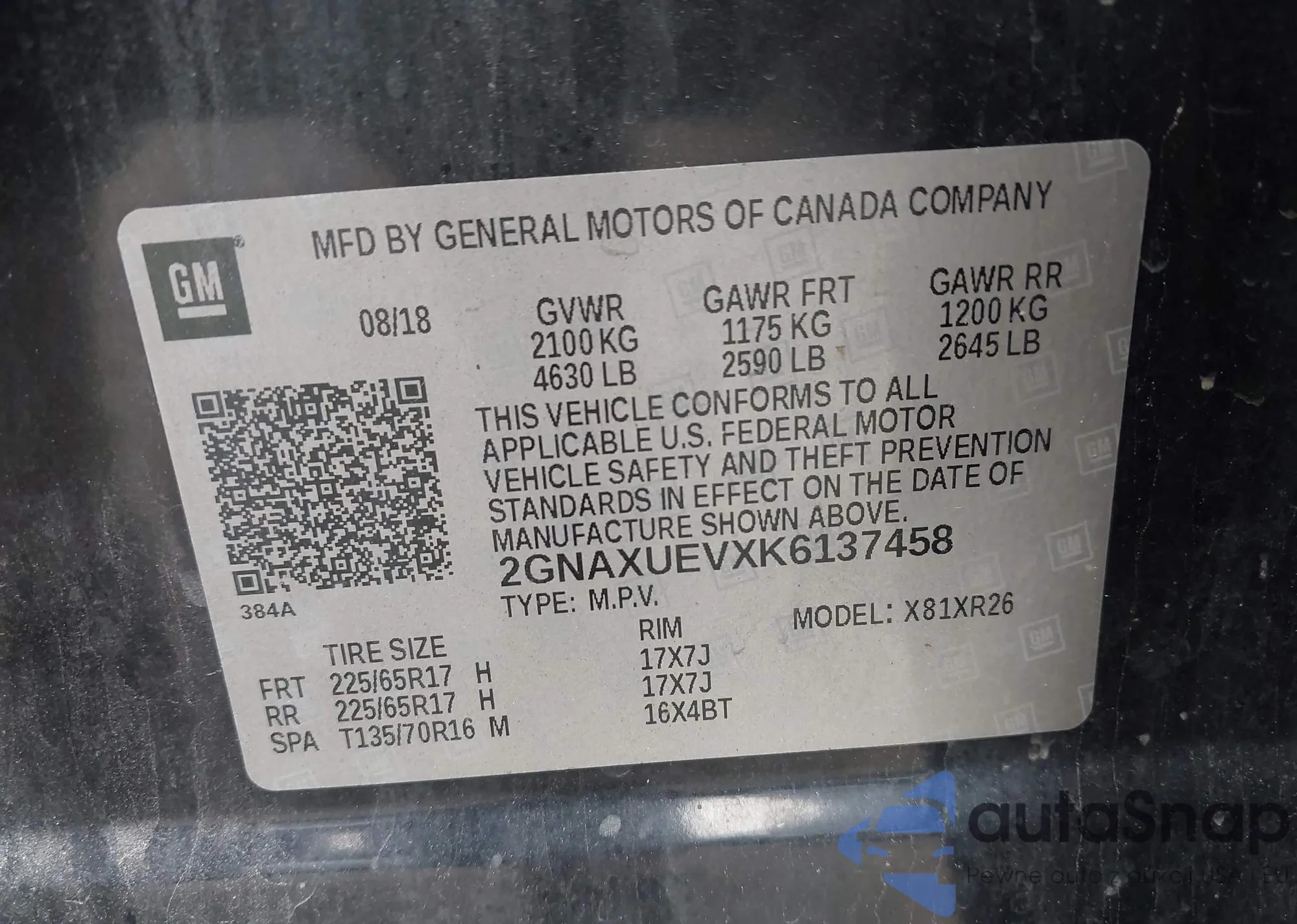 • VIN 2GNAXUEVXK6137458