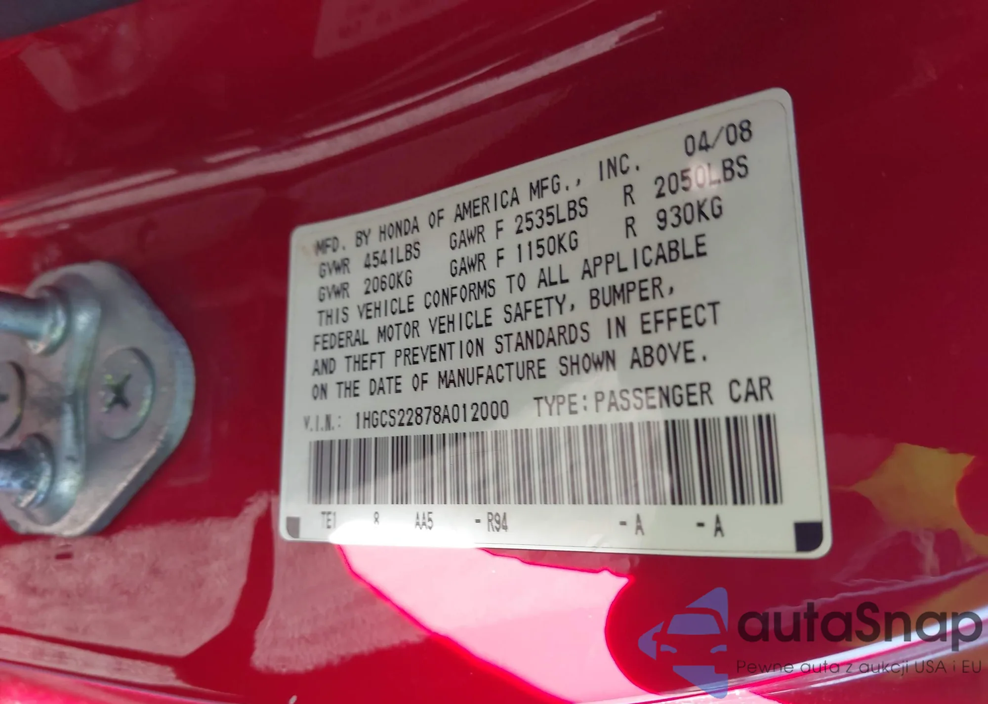 LOT: 42783475 VIN: 1HGCS22878A012000