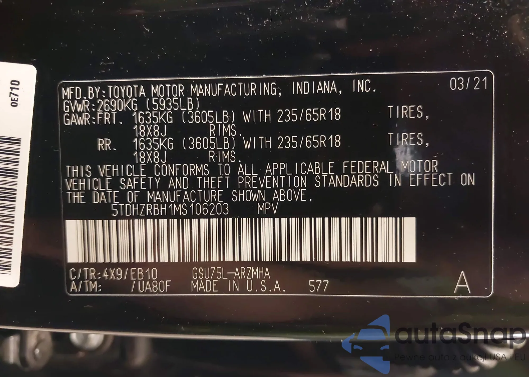 LOT: 42645027 VIN: 5TDHZRBH1MS106203